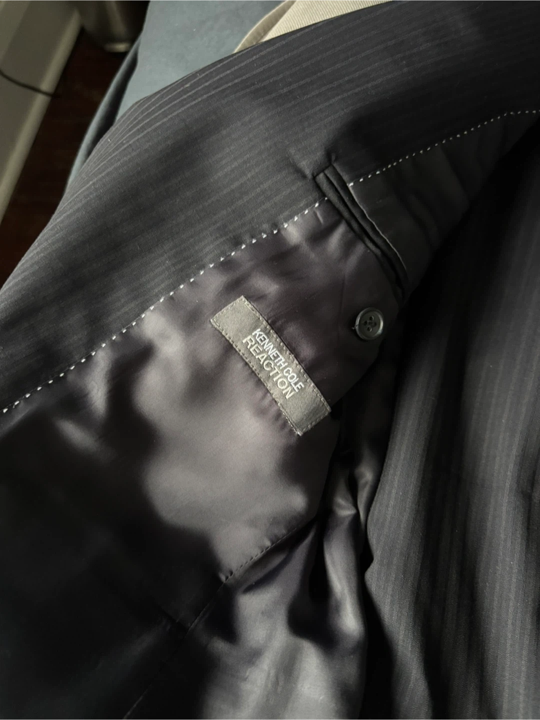 Elevate your professional wardrobe with this Kenneth Cole Reaction suit in size 38S. The suit is in good condition, showcasing a classic pinstripe pattern. Perfect for business meetings or formal events, this suit combines style and comfort.
