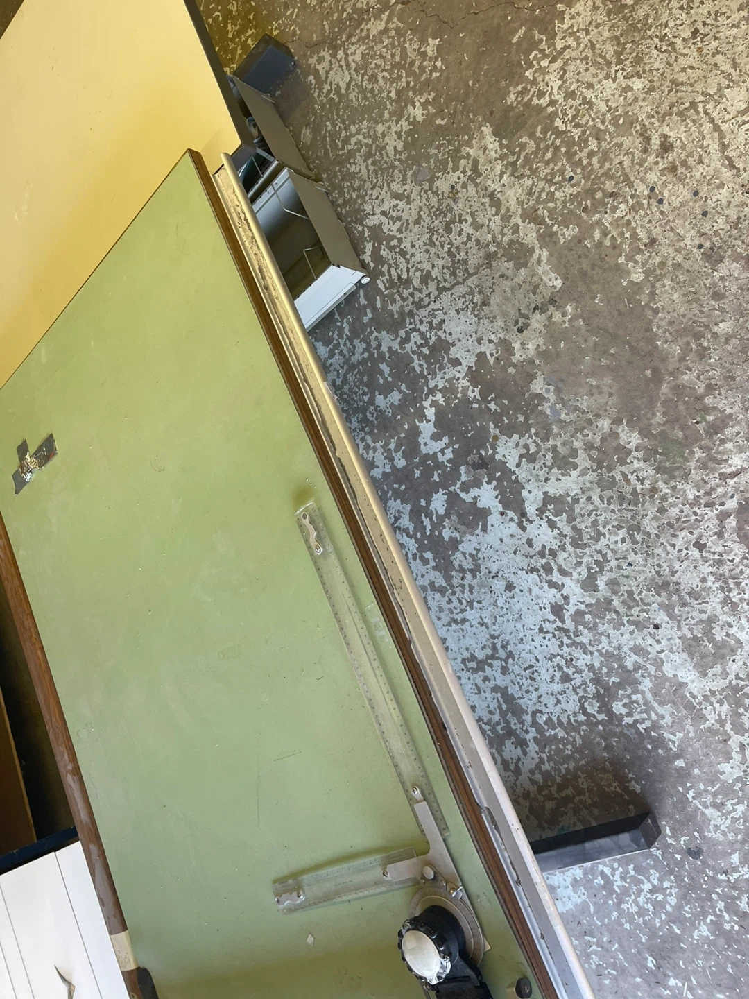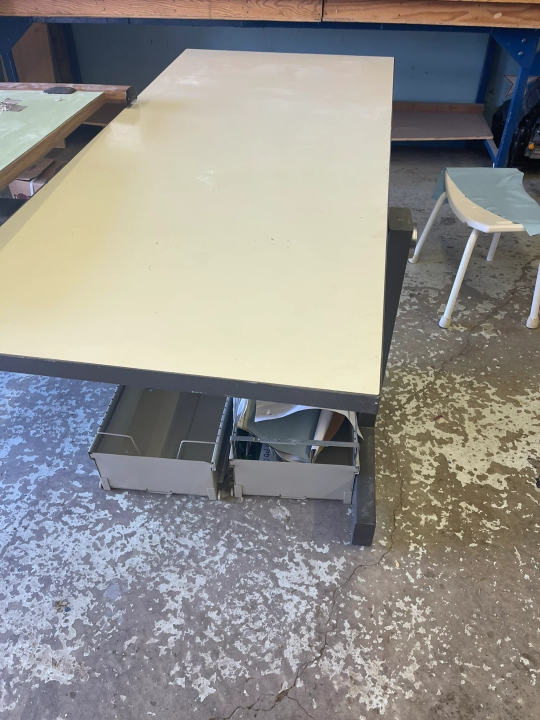 Adjustable drafting table with a large drawing board surface. It's built with a sturdy metal frame and includes two storage drawers underneath. The drawing board is hinged and can be tilted to various angles for comfortable use. Green table 5’ W x 45.5” D x 37” H. White table 67”W x 30”D x 30”H. No Delivery you will need a truck. Cash only