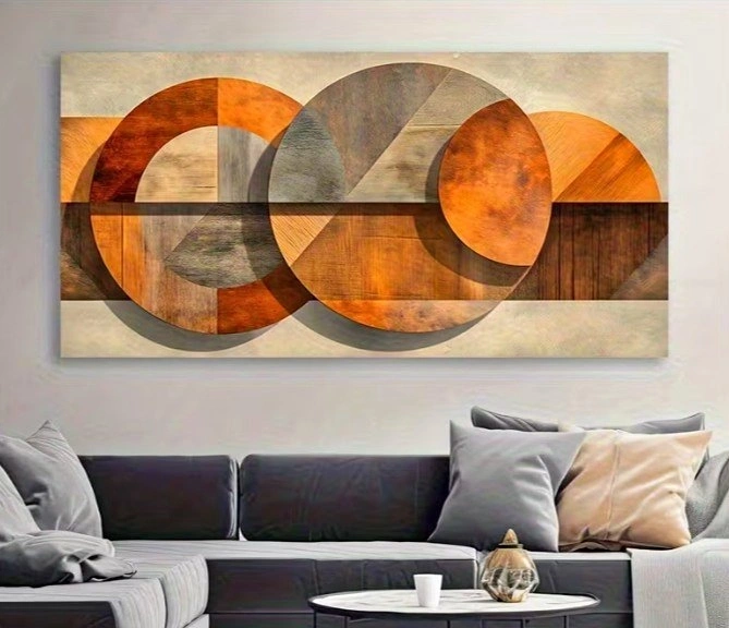 Bring warm, earthy vibes into your home with this striking geometric abstract canvas! This large 52x24" piece features a beautiful composition of interlocking circles and sharp lines in rich terracotta, burnt orange, warm browns, and cool greys. It is the perfect statement piece to complete your living room, bedroom, or home office. Whether your style is Mid-Century Modern, Boho, or Contemporary, the warm tones in this artwork will instantly make your space feel cozier and more stylized. Perfect Statement Size: 52 by 24 inches — a wide, horizontal layout that looks fantastic centered over a sofa, bed, or dining buffet. Condition: 100% Brand New. Printed on premium high-resolution canvas for sharp details and rich, fade-resistant colors. Completely borderless gallery wrap for a clean, edge-to-edge modern aesthetic. Surprisingly lightweight, making it incredibly easy to transport and hang on your wall without heavy-duty anchors. Let me know if you're interested!