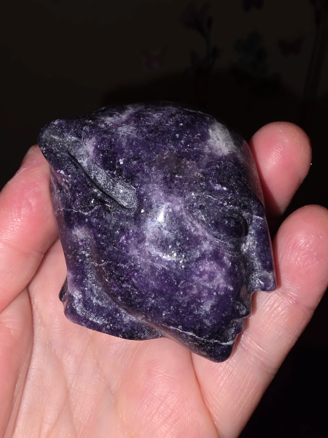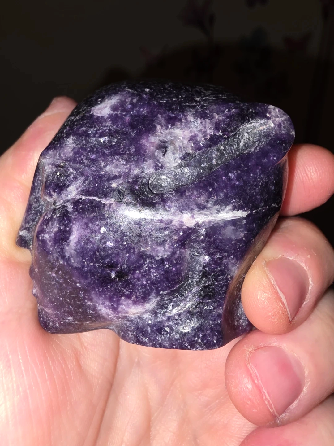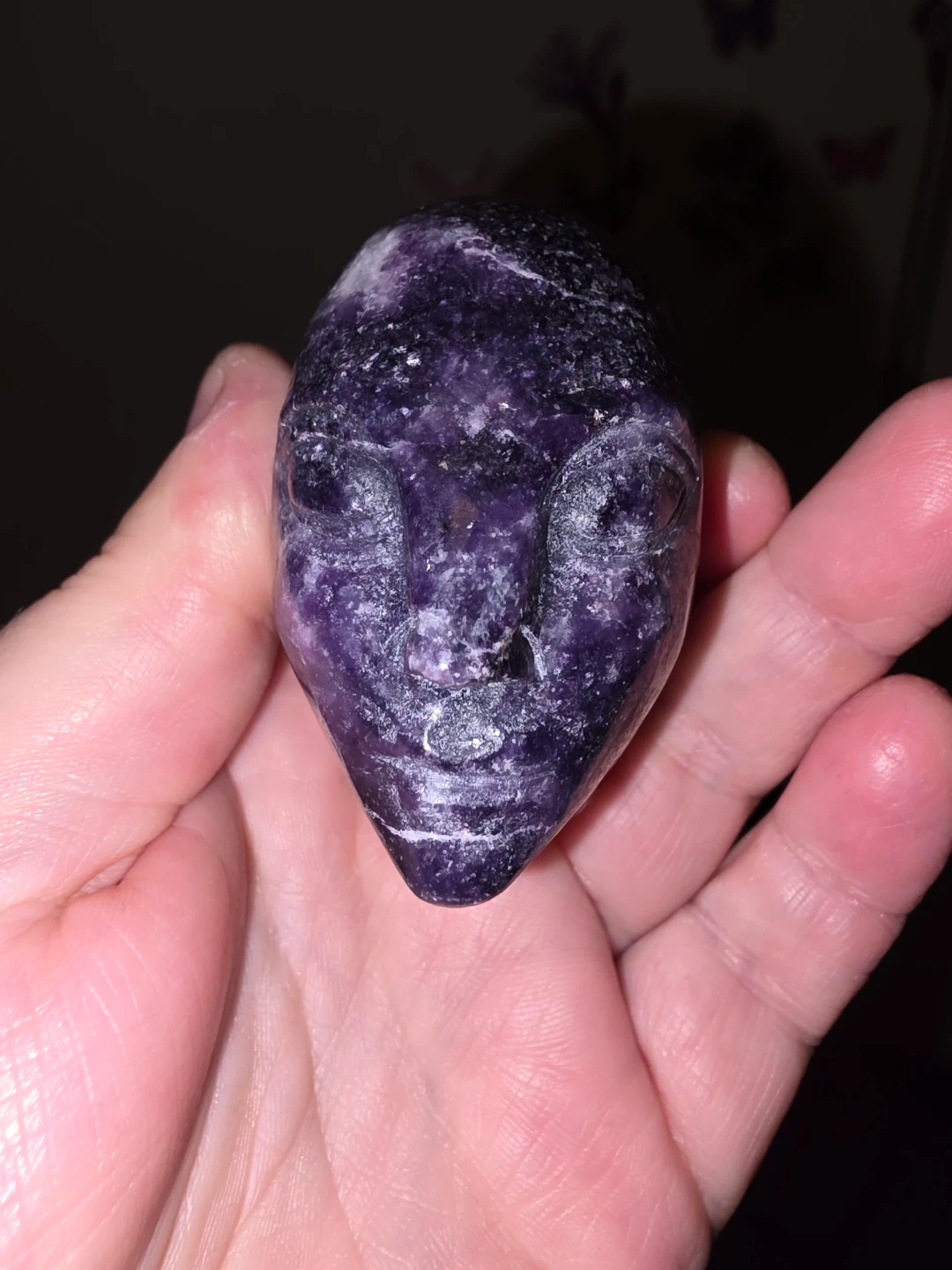 This is a unique carving of avatar made from lepidolite. It's a lovely decorative piece for any space.