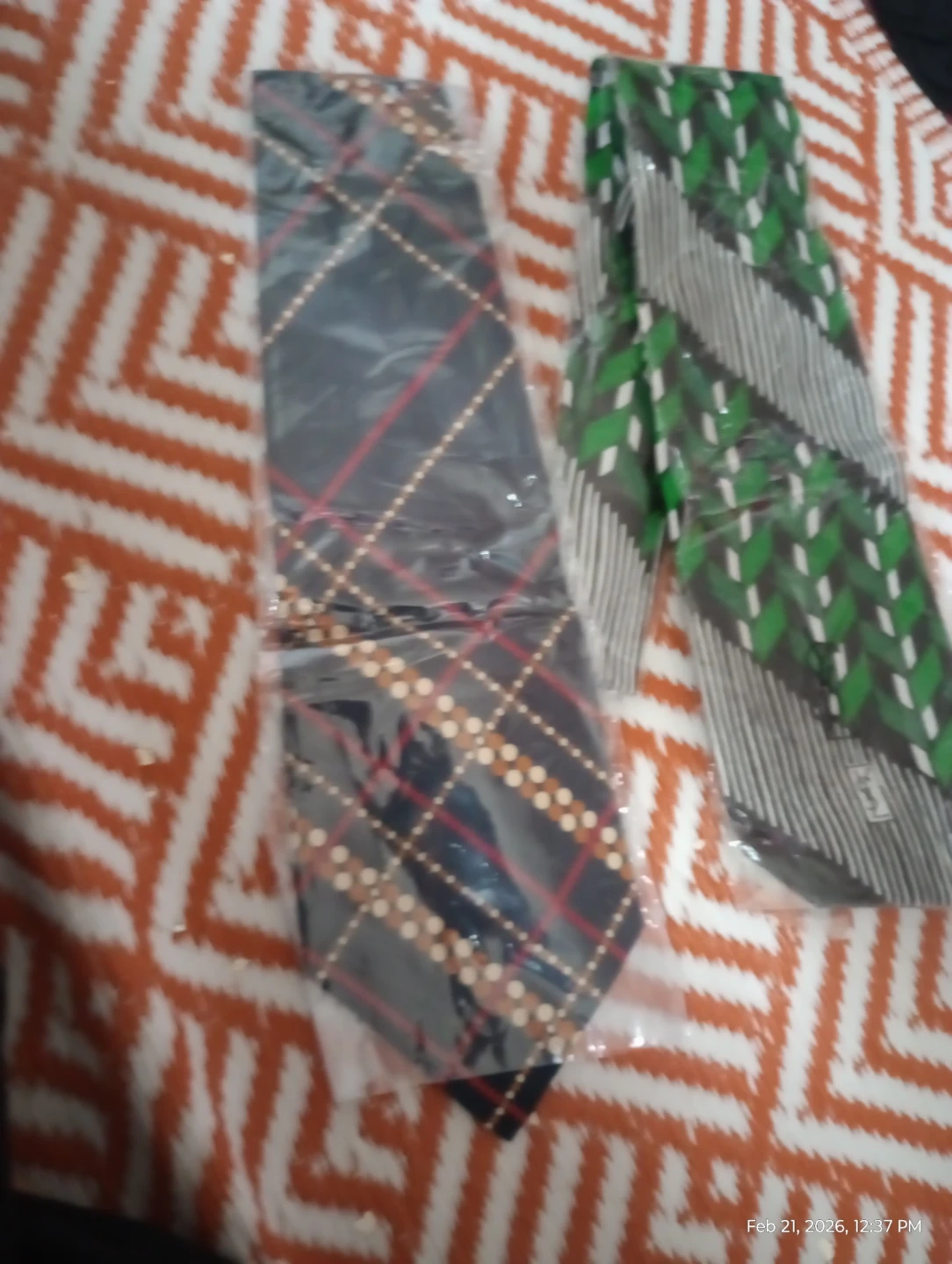 This listing includes two ties. One tie features a dark blue background with a red and yellow plaid pattern. The second tie is primarily green and gray with a geometric pattern. Both ties are individually wrapped.