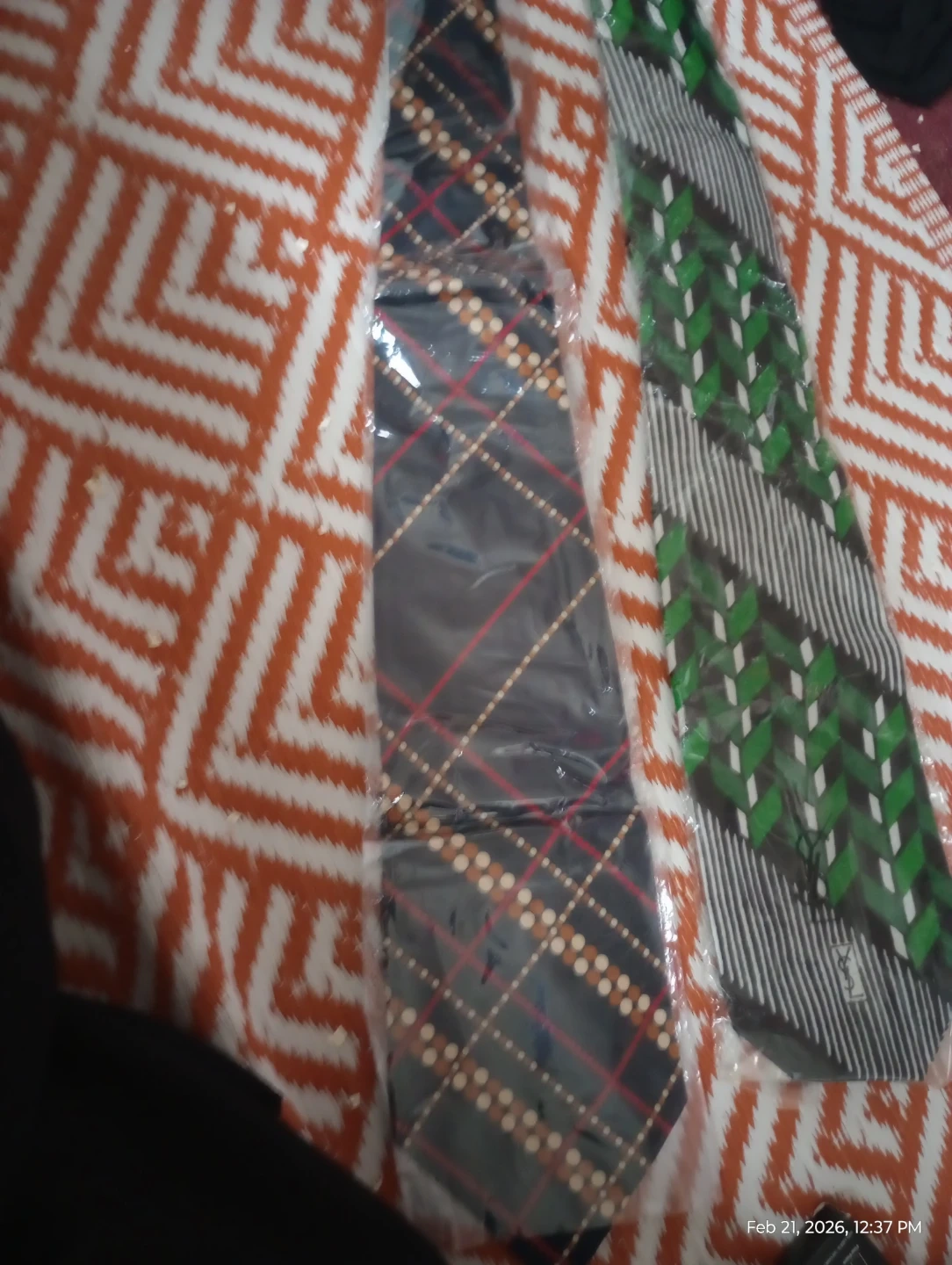 This listing includes two ties. One tie features a dark blue background with a red and yellow plaid pattern. The second tie is primarily green and gray with a geometric pattern. Both ties are individually wrapped.