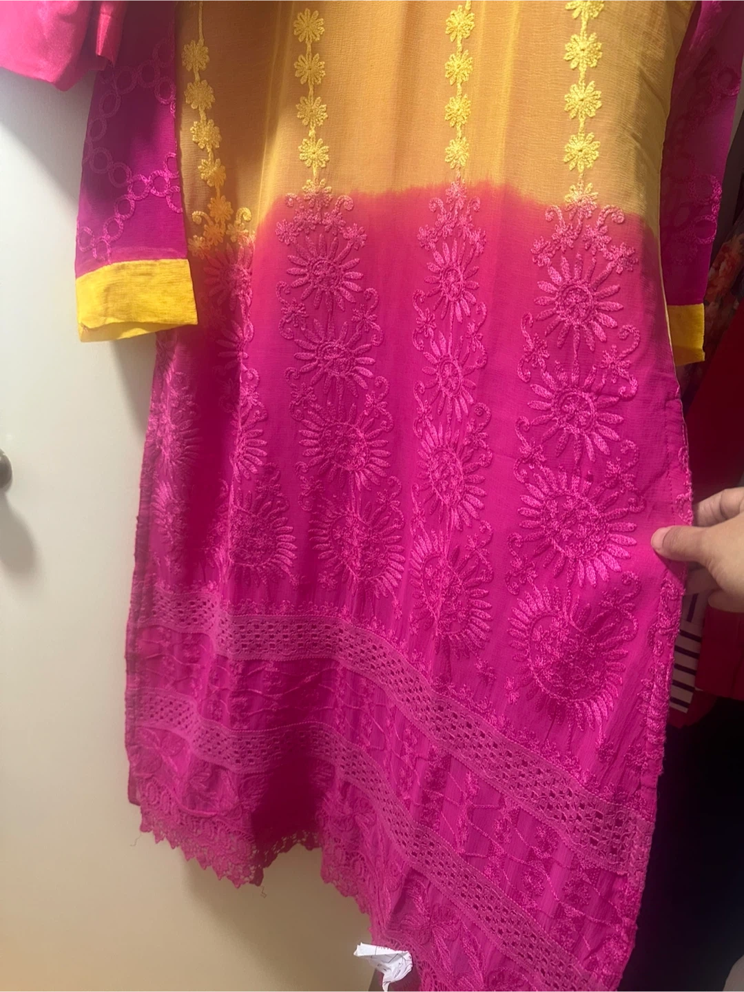 Beautiful salwar kameez in pink and yellow with all over intricate embroidery. Perfect for a special occasion or everyday wear. The set includes the kameez (tunic), salwar (pants), and dupatta (scarf).