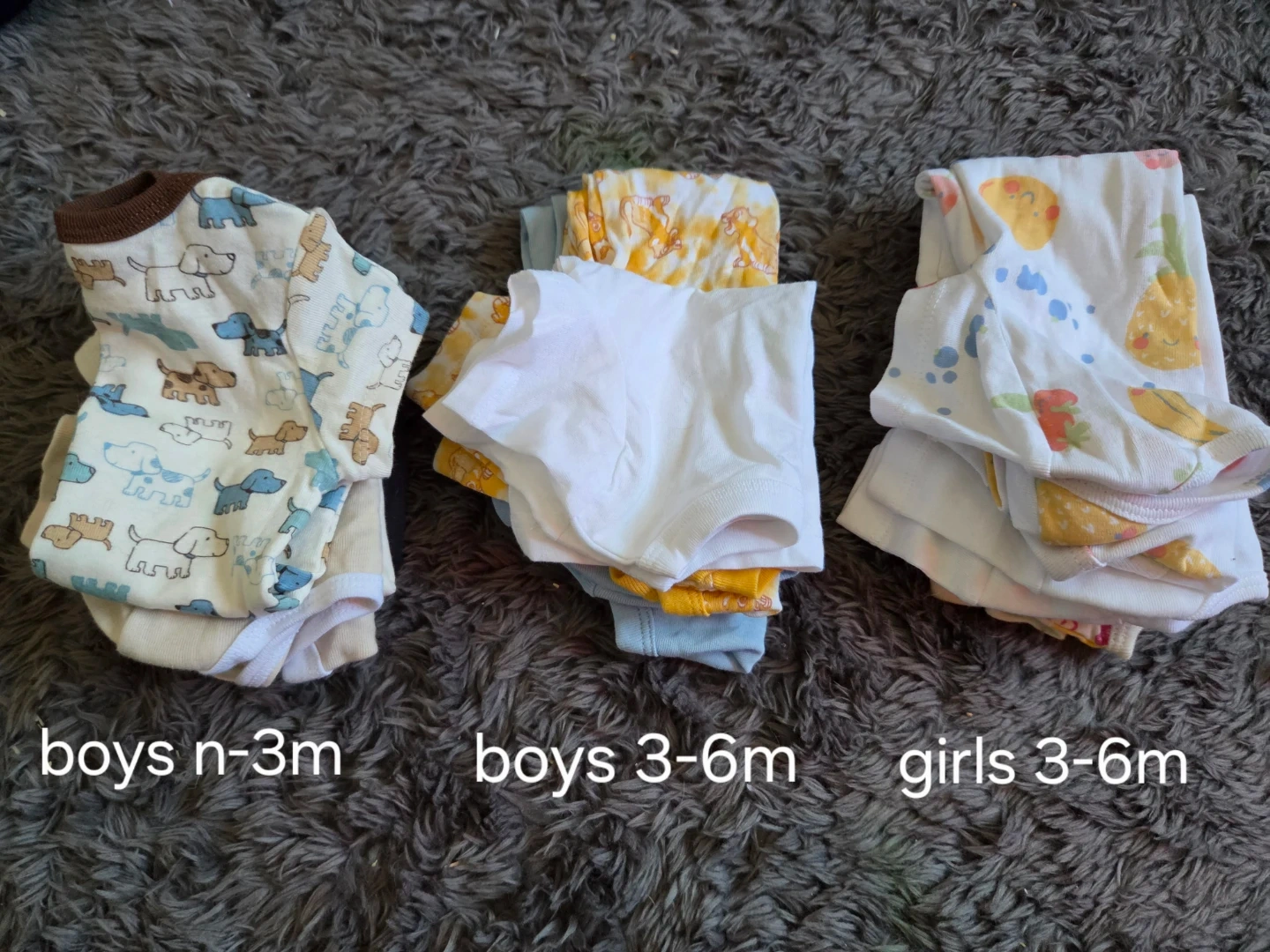 These bundles includes a variety of baby clothes, all great quality with minimal to no stains.