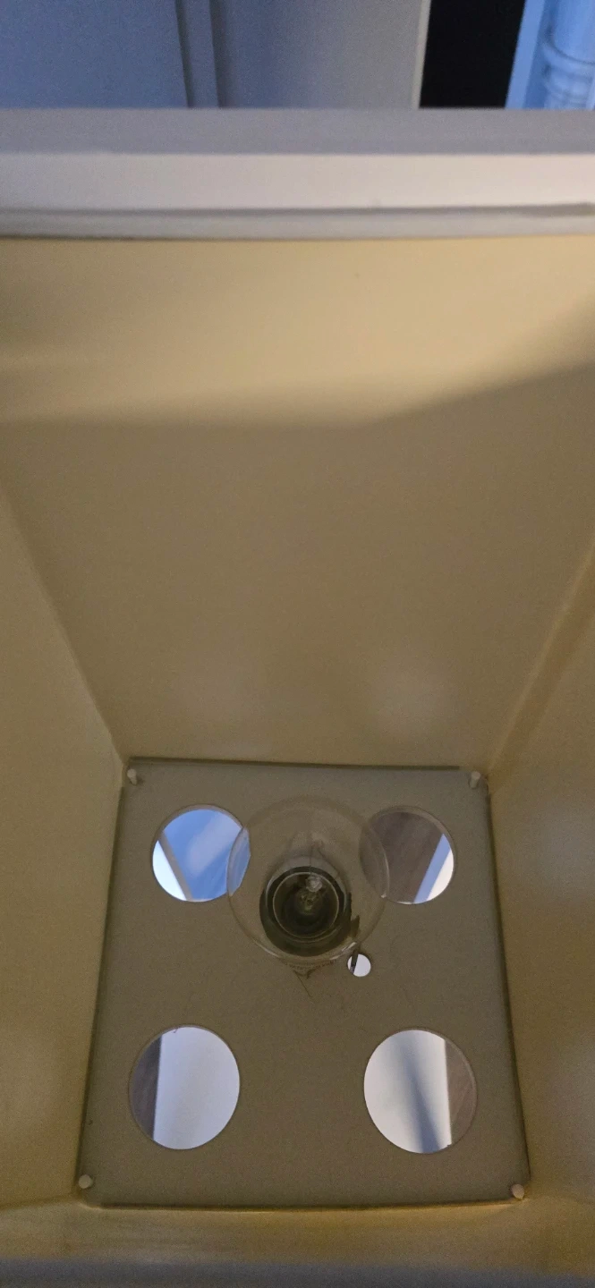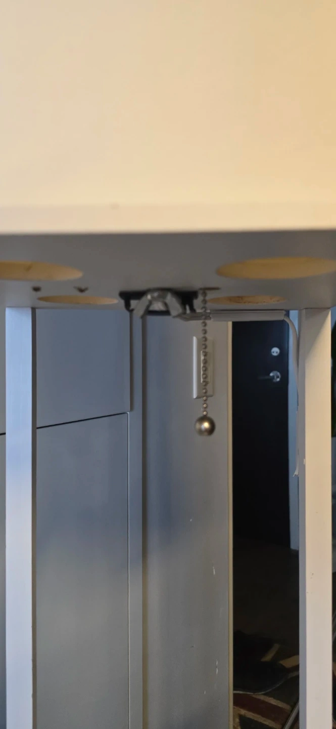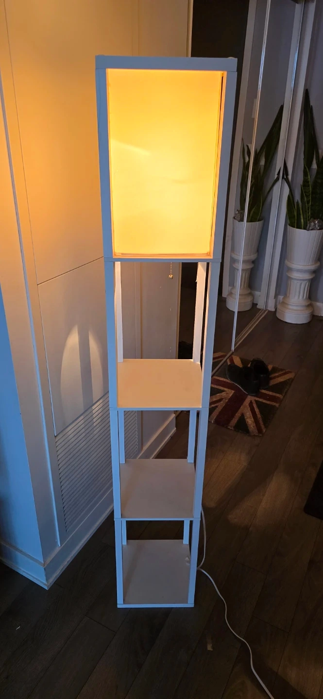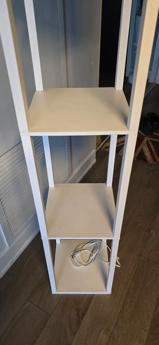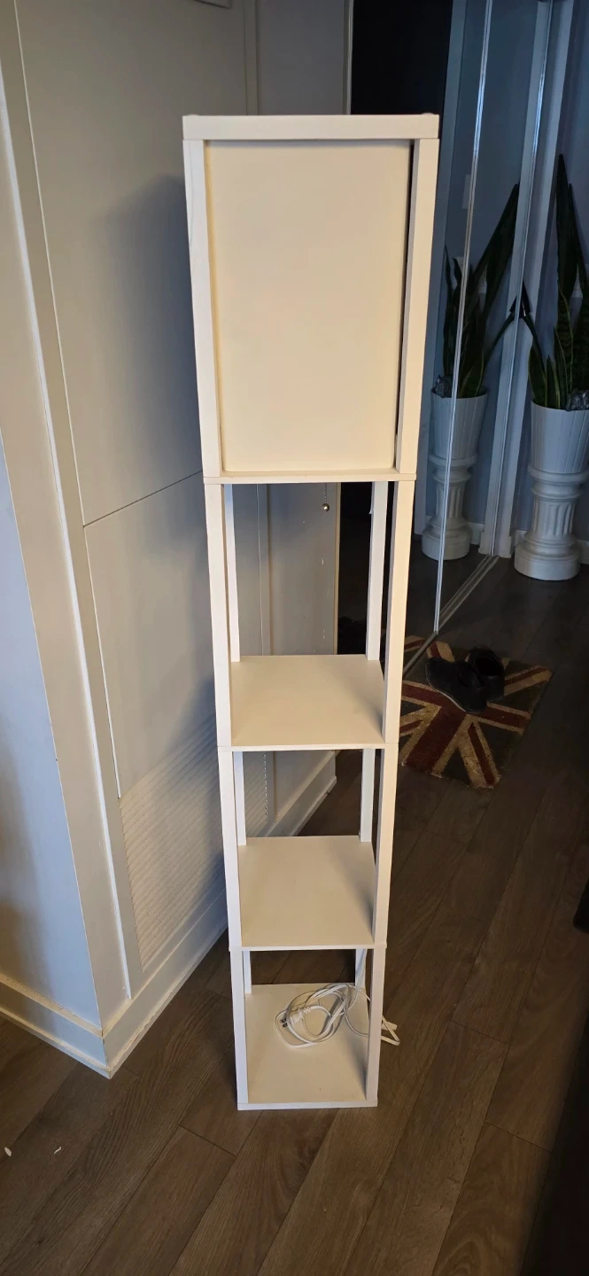 Selling a shelf floor lamp! It features a white frame with shelves and a light at the top. Perfect for adding both light and storage to any room
