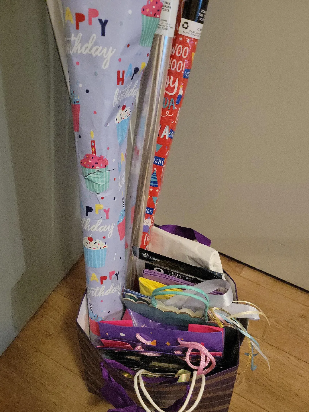 A collection of 8+ gift bags in various sizes and colours, some rolls of wrapping paper, and ribbon. Perfect for birthdays or any gift-giving occasion!