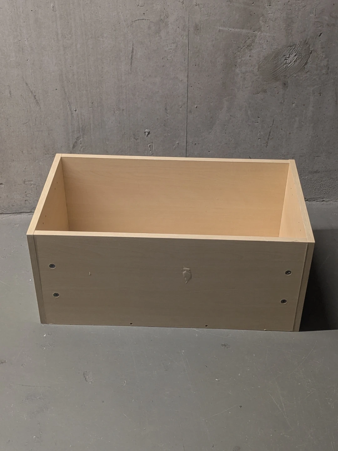 A simple wooden storage box. Made of light-coloured wood. Great for organizing shelves or drawers. Fits neatly into spaces.