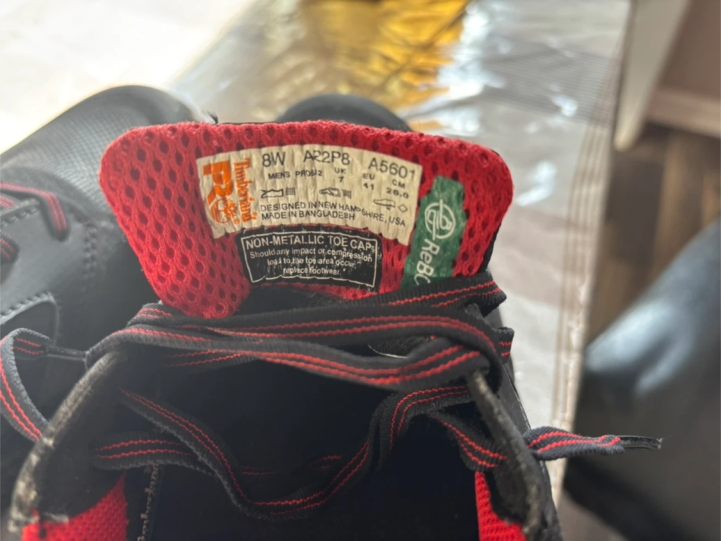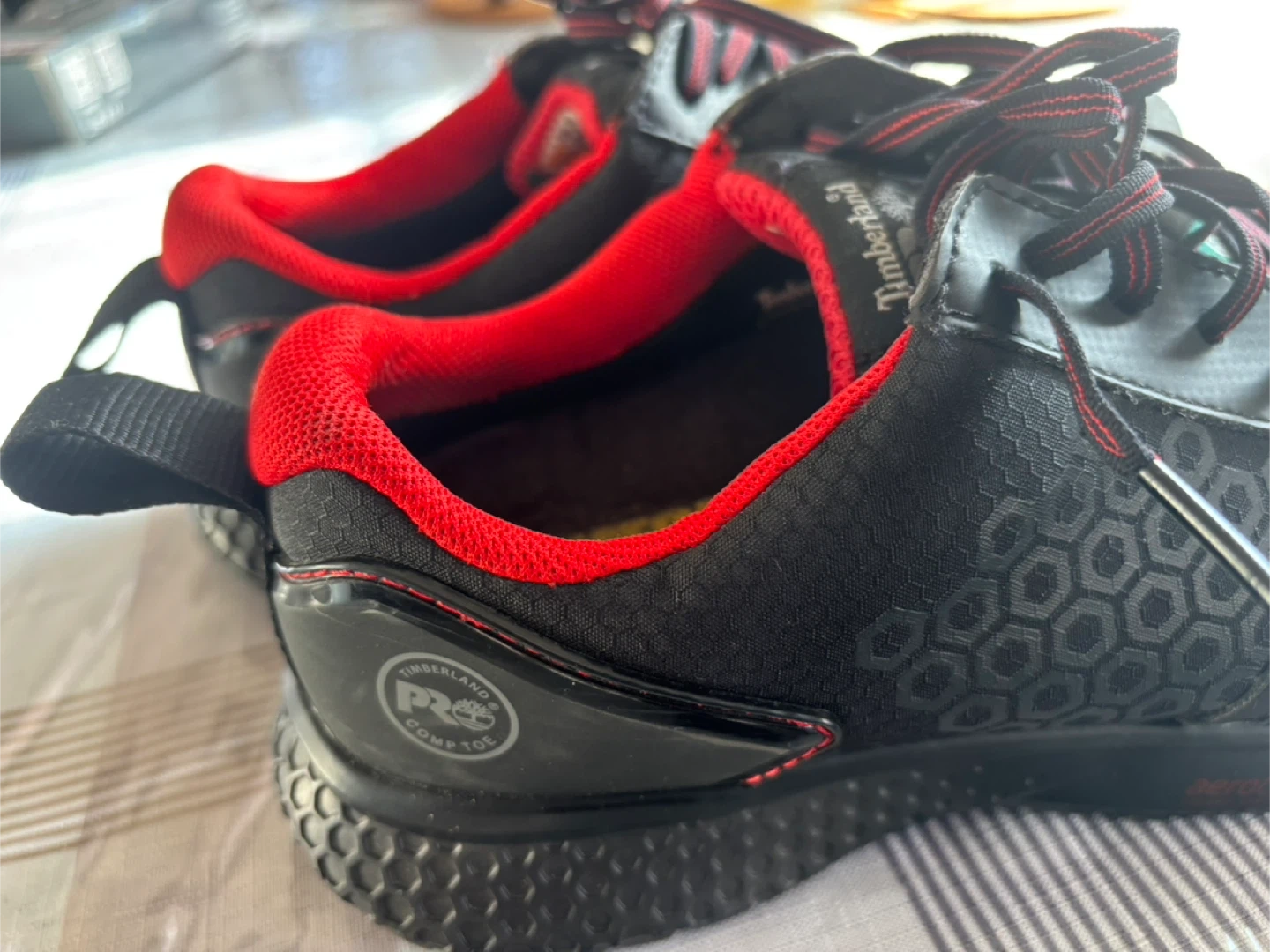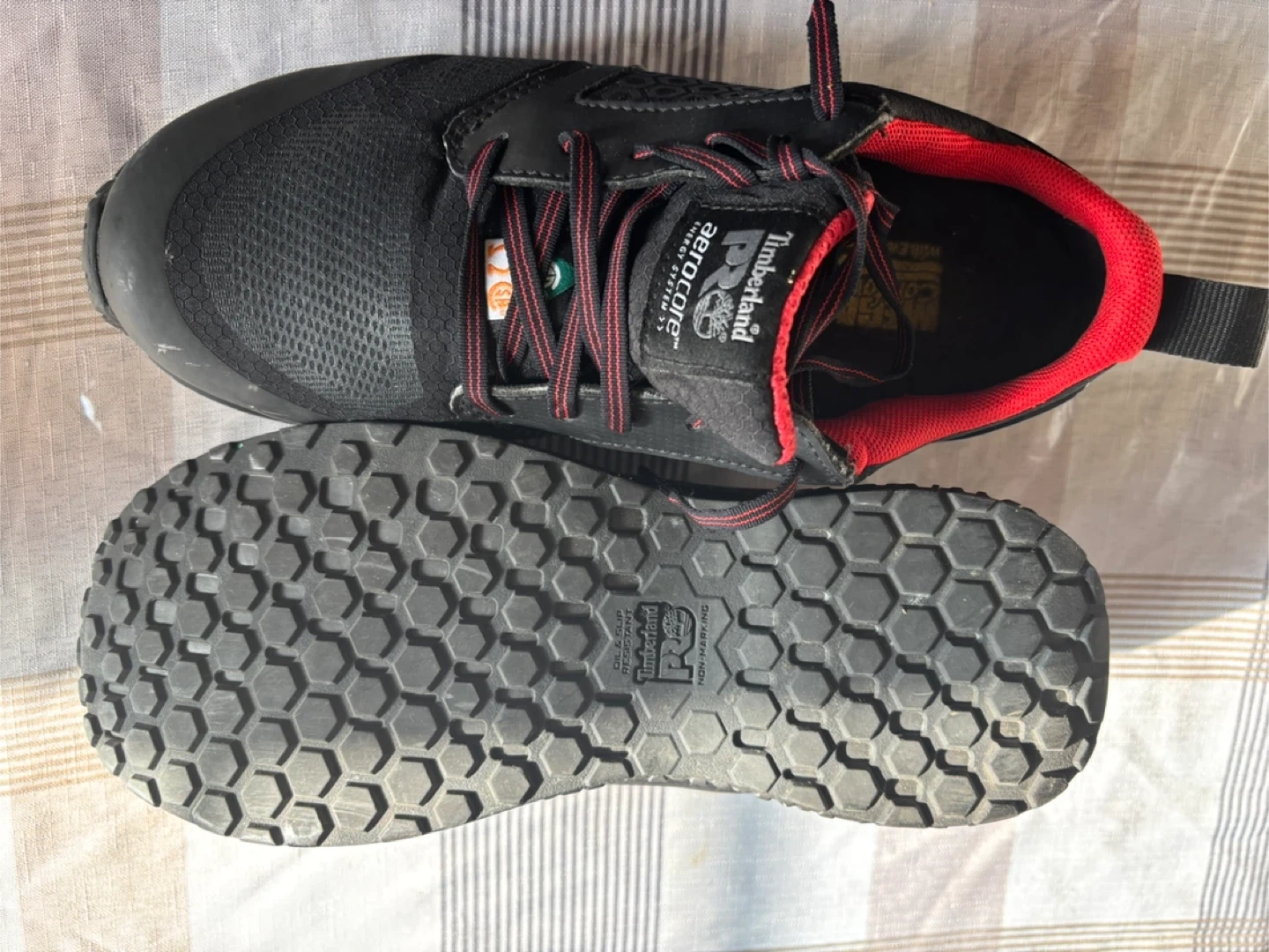 Timberland PRO Aerocore work shoes in black with red accents. Men's Pro Series size 8W, EU 41, UK 7, CM 26.0. Features non-metallic toe cap. Designed in New Hampshire, USA.