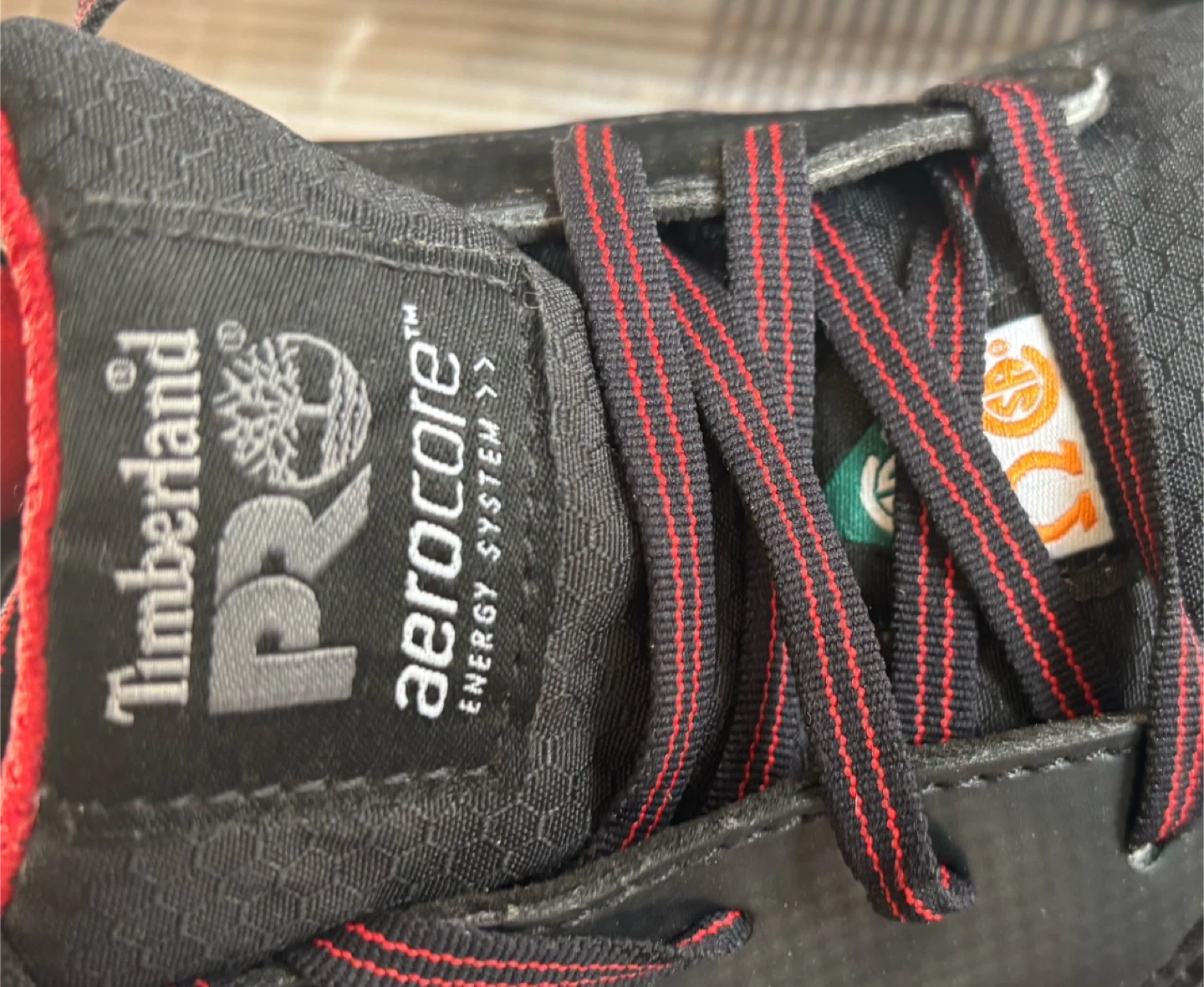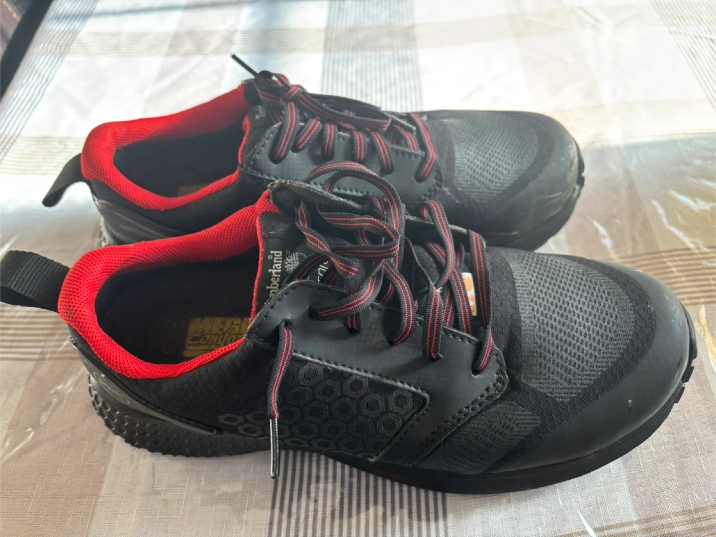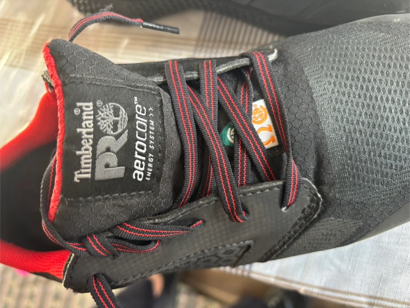 Timberland PRO Aerocore work shoes in black with red accents. Men's Pro Series size 8W, EU 41, UK 7, CM 26.0. Features non-metallic toe cap. Designed in New Hampshire, USA.
