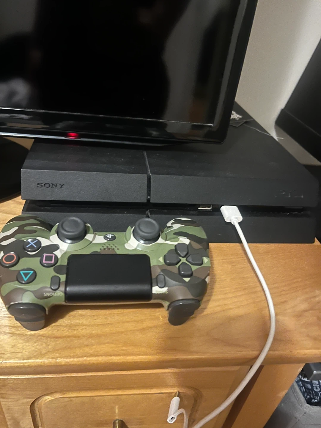 Selling a used PlayStation 4 with a camouflage-patterned controller. The console is in good working condition and comes with a controller. Perfect for some gaming fun!