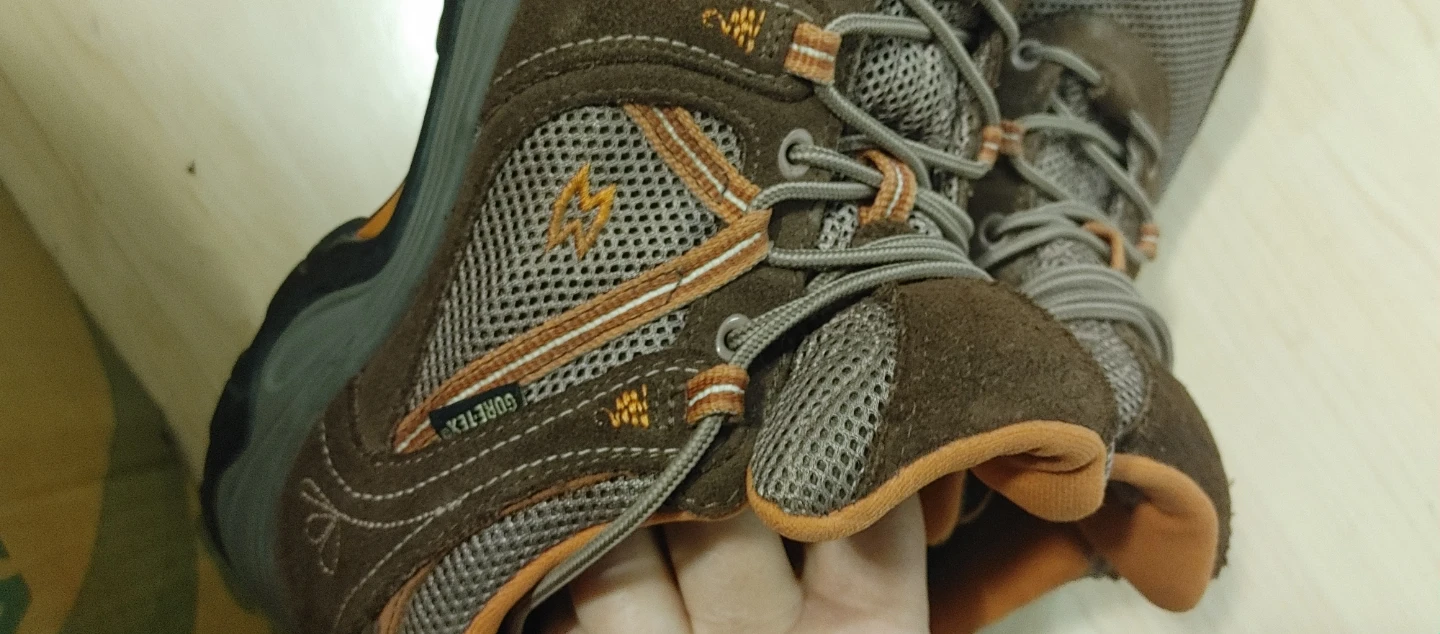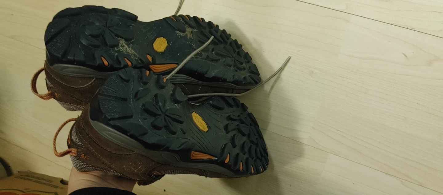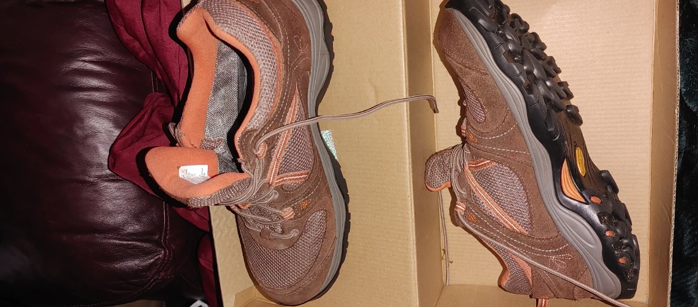 Selling a pair of Garmont women's Amica brown suede and mesh trail hiking shoes in size 8.5. They're in nearly New condition and ready for some outdoor adventures! The shoes feature Gortex and a durable Vibram sole for great traction. They come in a brown and orange colour combination. The size is US 8.5 / EUR 40