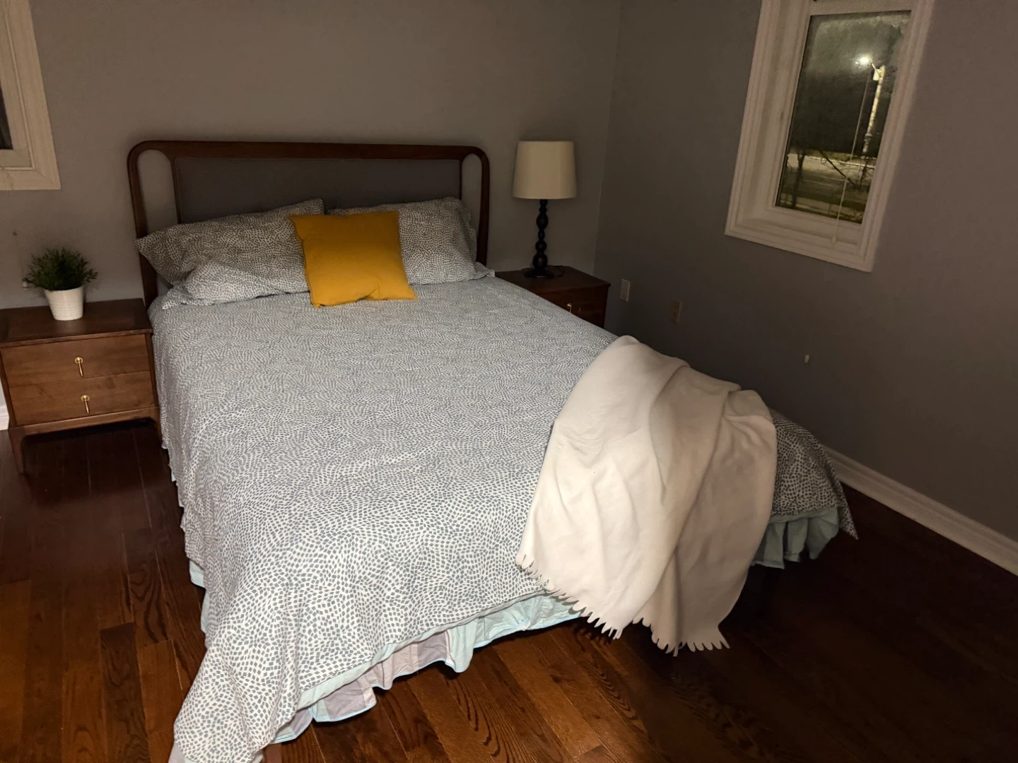Wooden bed frame with a grey upholstered headboard. Includes two matching nightstands with two drawers each. The bed features a patterned duvet and a white throw blanket.
