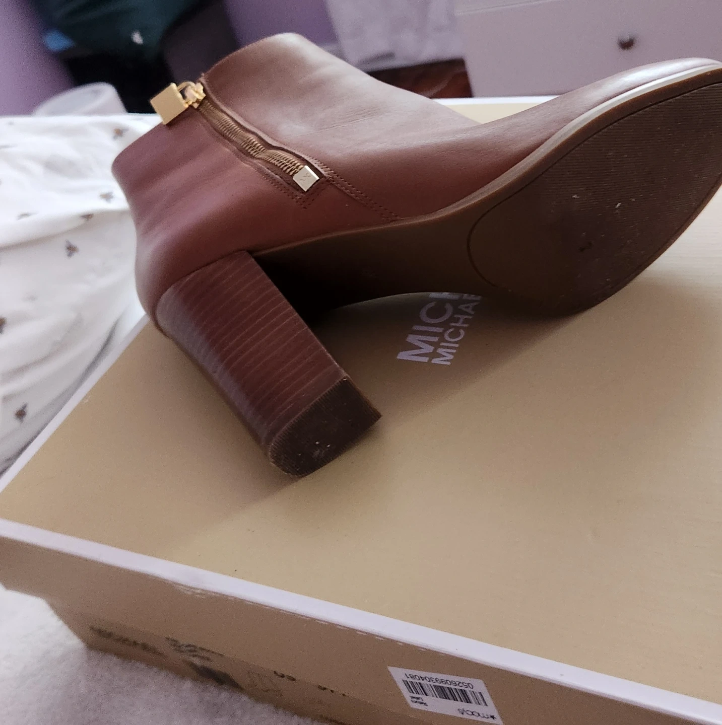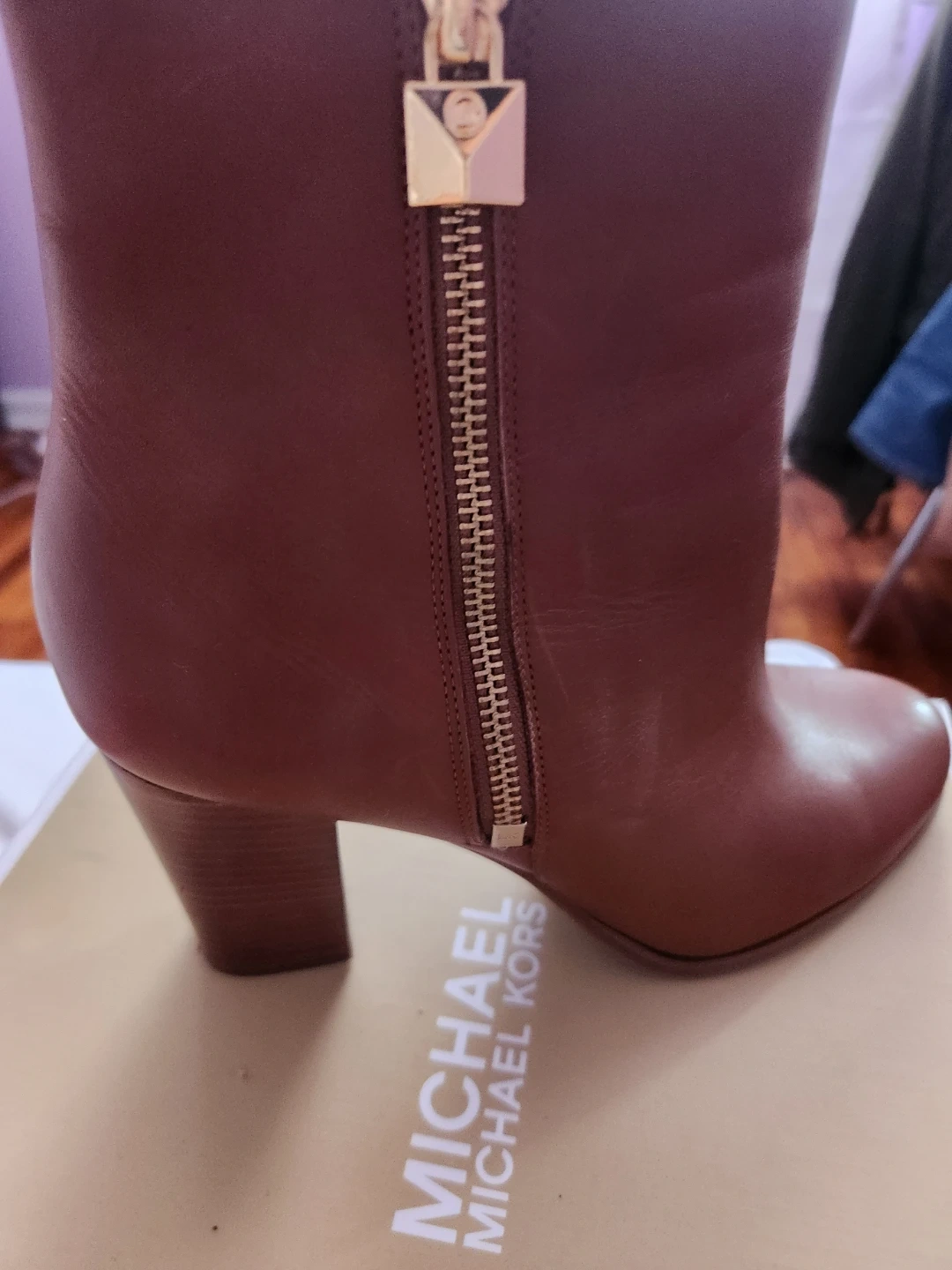 Stylish brown leather ankle boots from Michael Kors. They feature a side zipper with a gold-tone charm detail and a block heel. Genuine leather construction.
