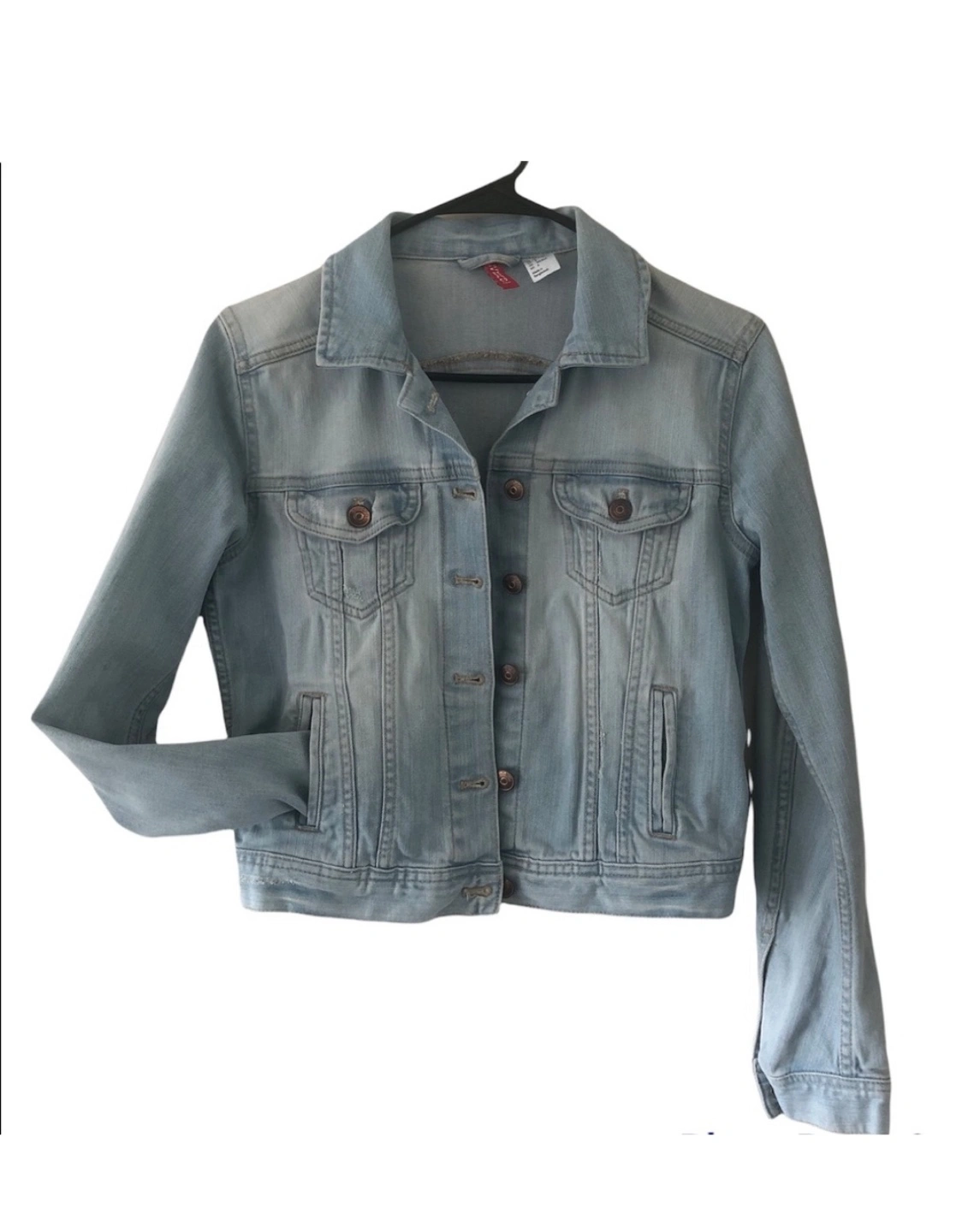 A light wash denim jacket, very casual. Featuring two front pockets on the chest and two on the lower front. Easy to throw on over any outfit for a simple, yet stylish look. Size US 6.