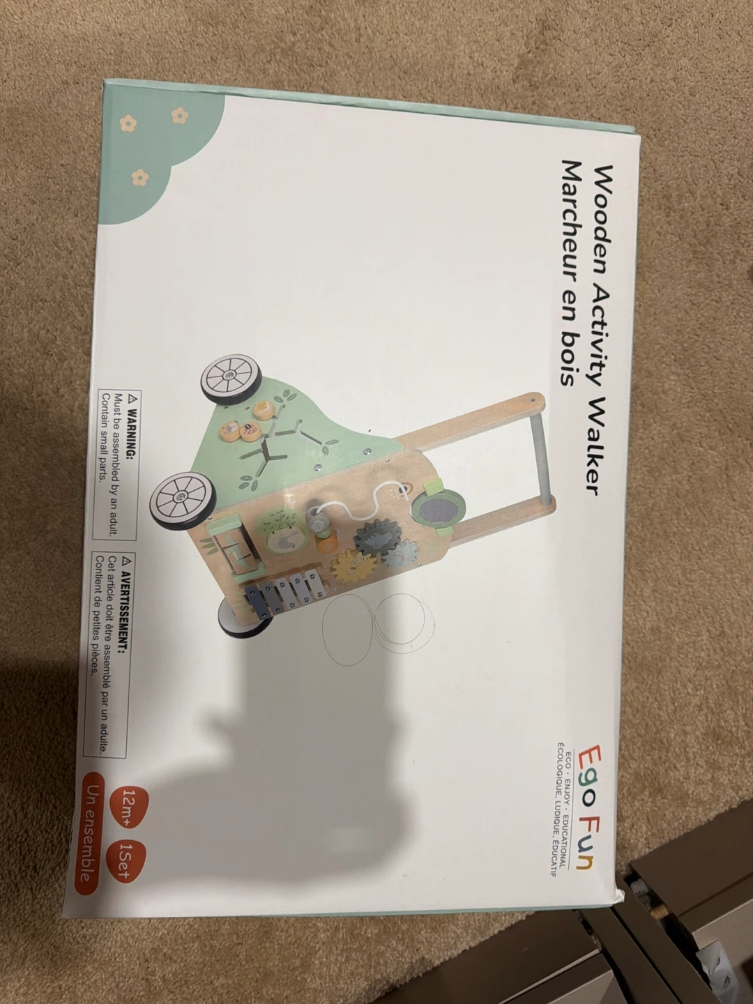 Wooden activity walker with fun interactive elements. Recommended for ages 12 months and up. Includes one set.