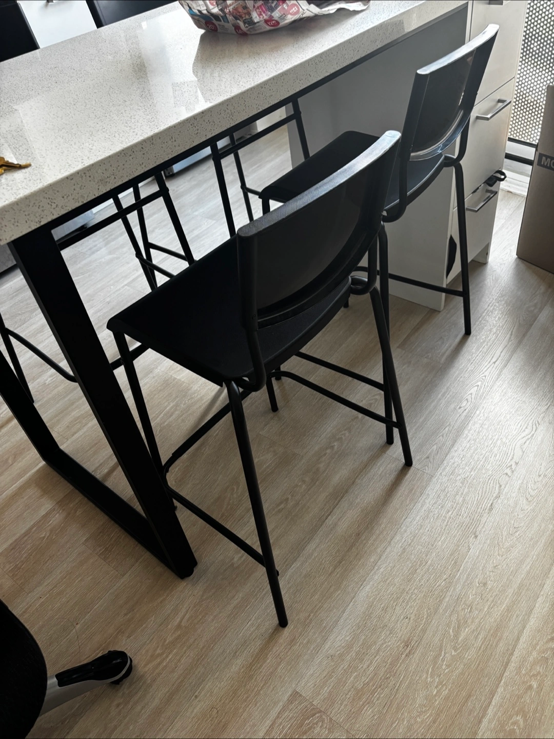 Selling a set of three bar stools. They're in great shape and would look great at any kitchen counter or bar area. They feature a sleek, modern design with a black finish.