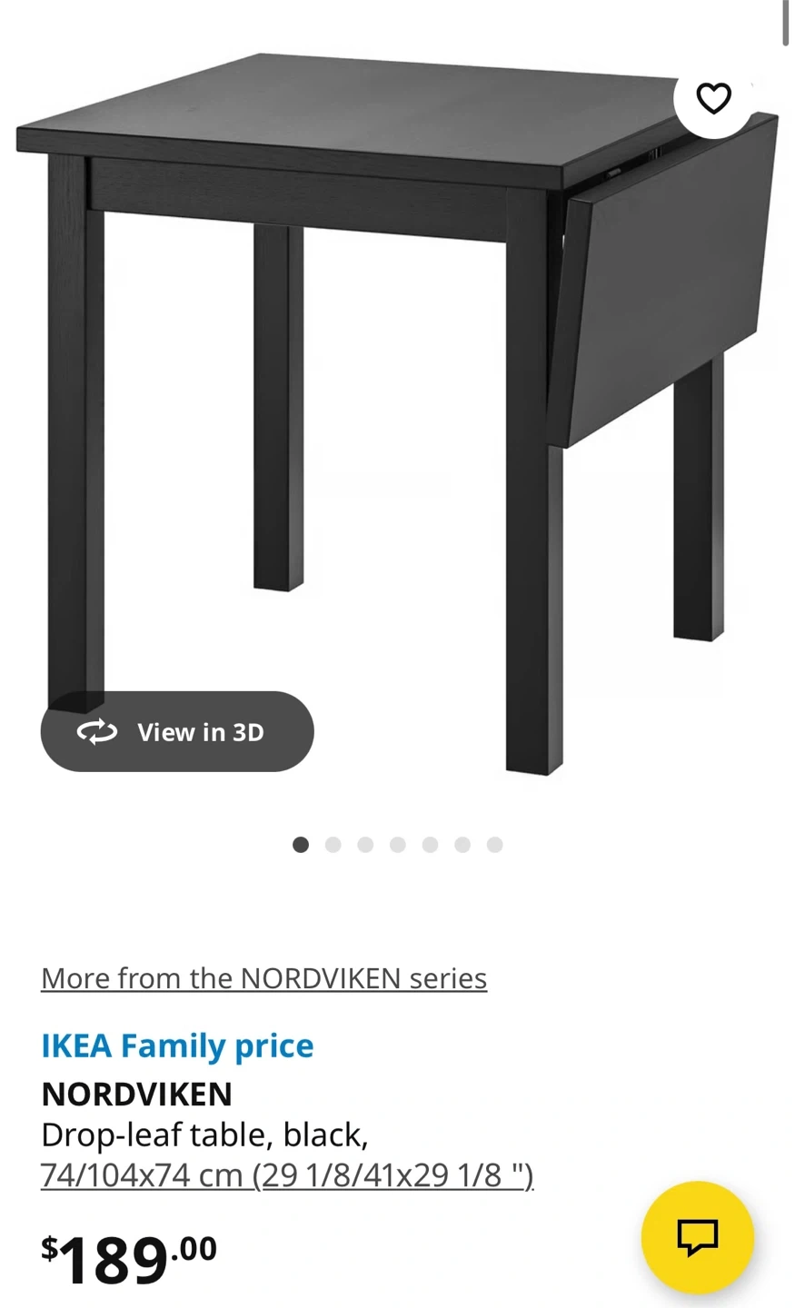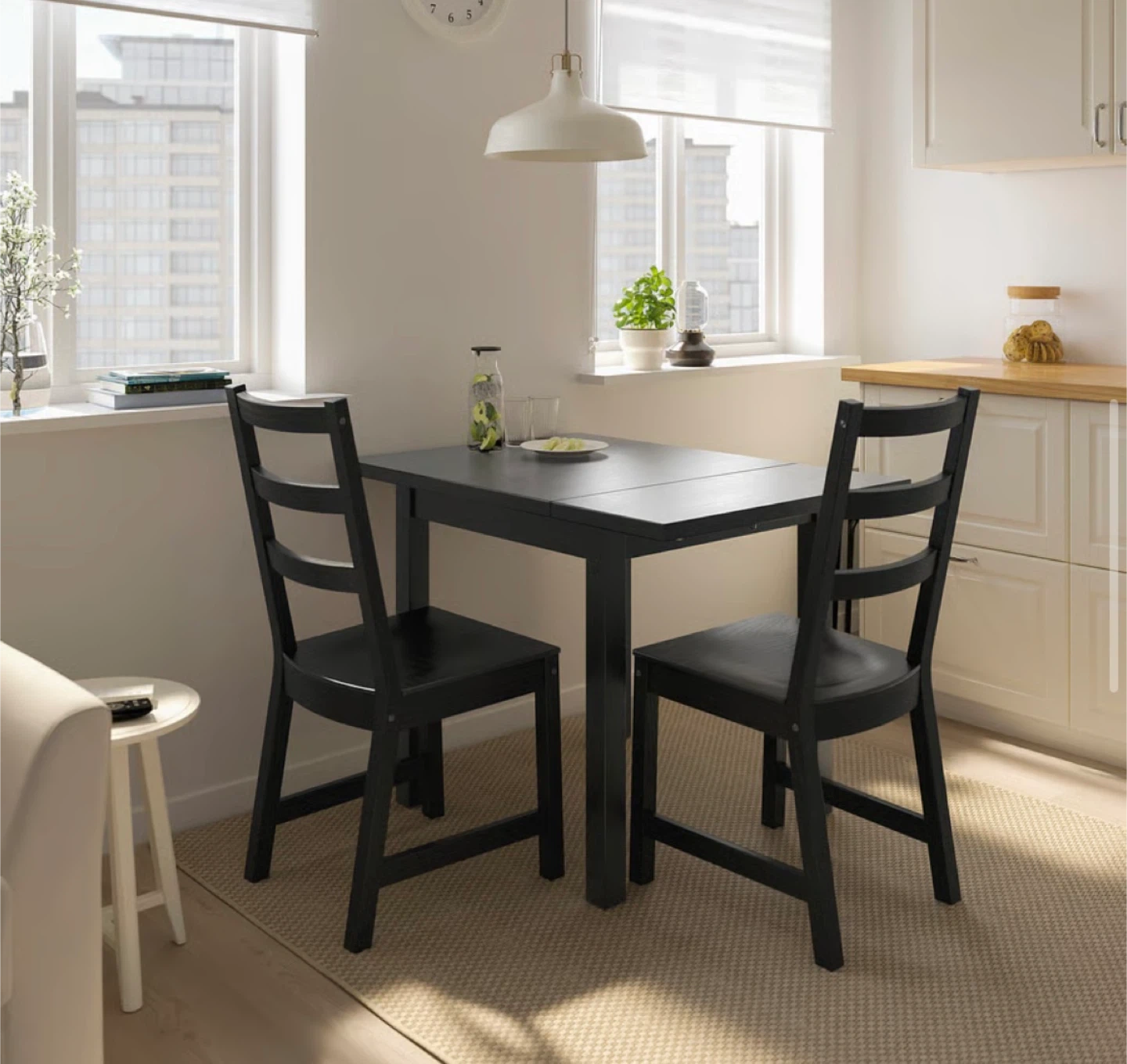 This is the IKEA NORVIKEN drop-leaf table in black. It's 74cm wide when both leaves are down, extending to 104cm when one leaf is up. The table's height is 75cm. This table's compact size and extendable leaves make it handy for smaller spaces or for when you need a bit more surface area!