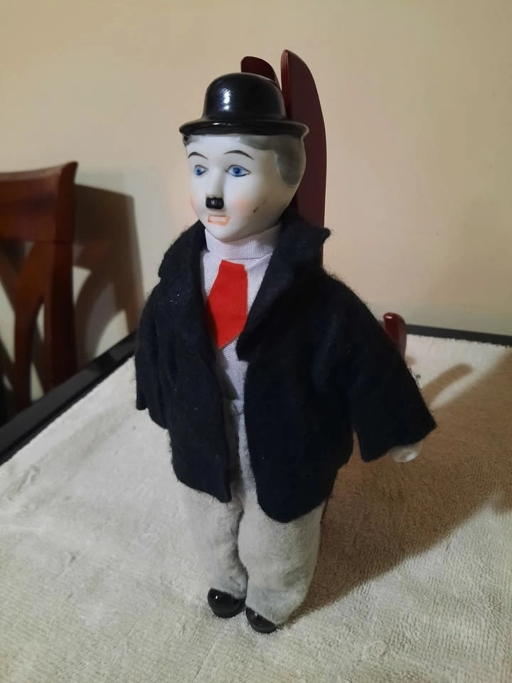 Hardy from Laurel and Hardy 9" doll. Porcelain head, feet, and hands. Felt clothing. Overall item is in good condition with minor scuffs.