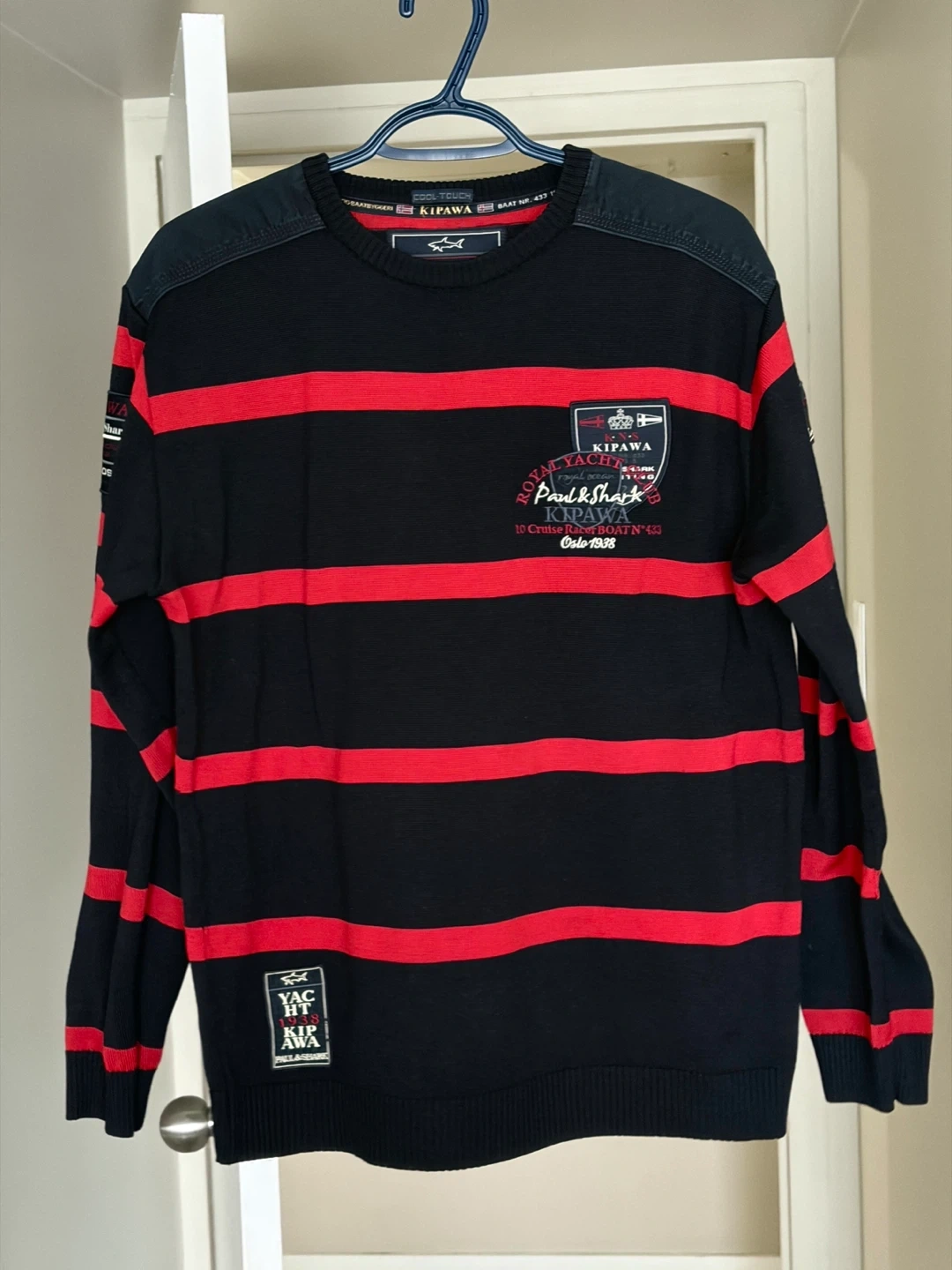 Selling a Paul & Shark sweater with red stripes on a black background. It's in great condition and ready for a new owner!