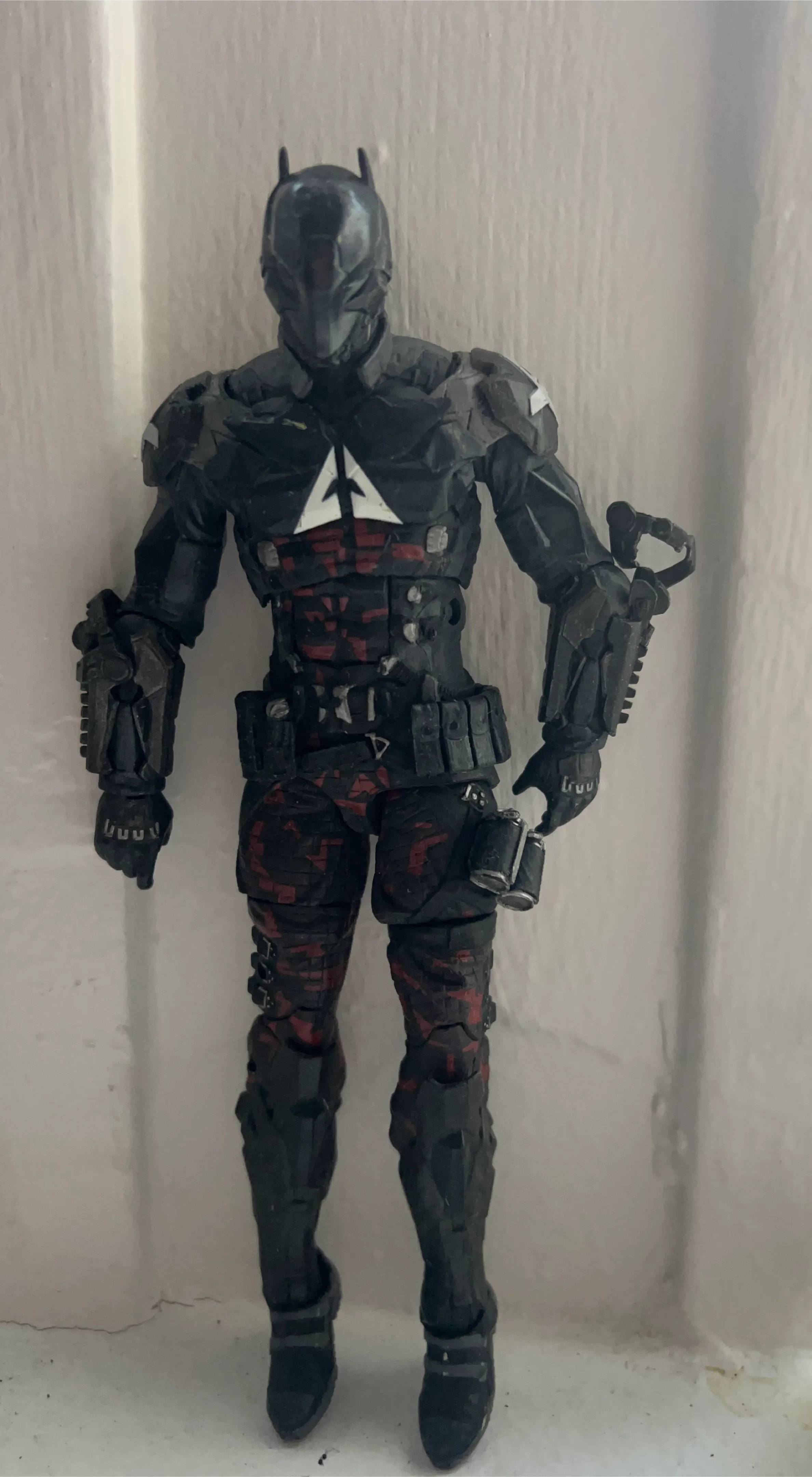 This is an action figure of Batman from the Arkham Knight video game. It's black with red and white accents. The figure has intricate details and comes with accessories.