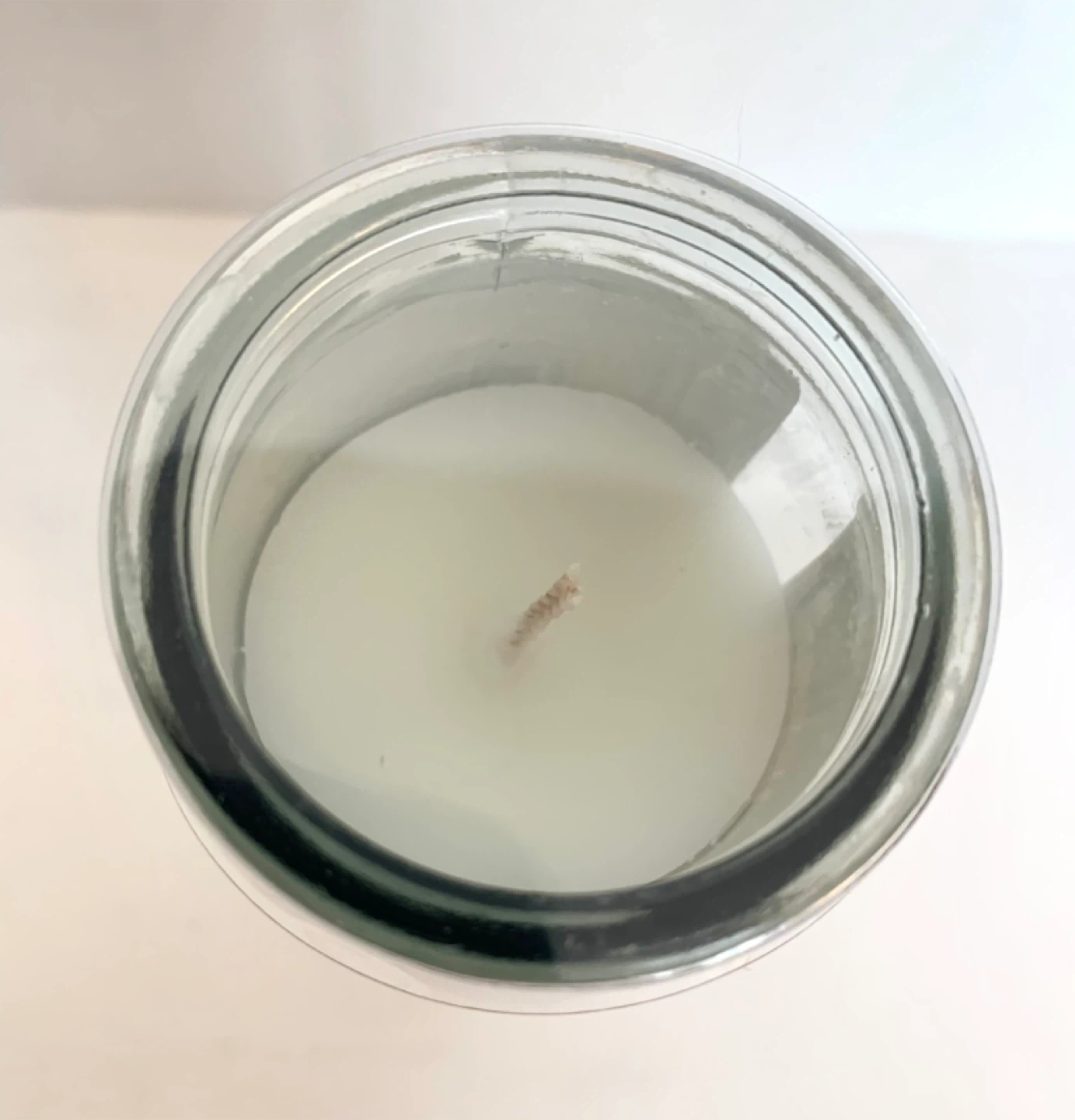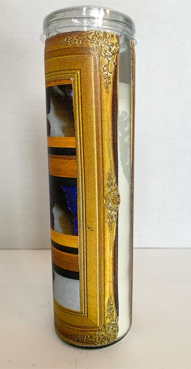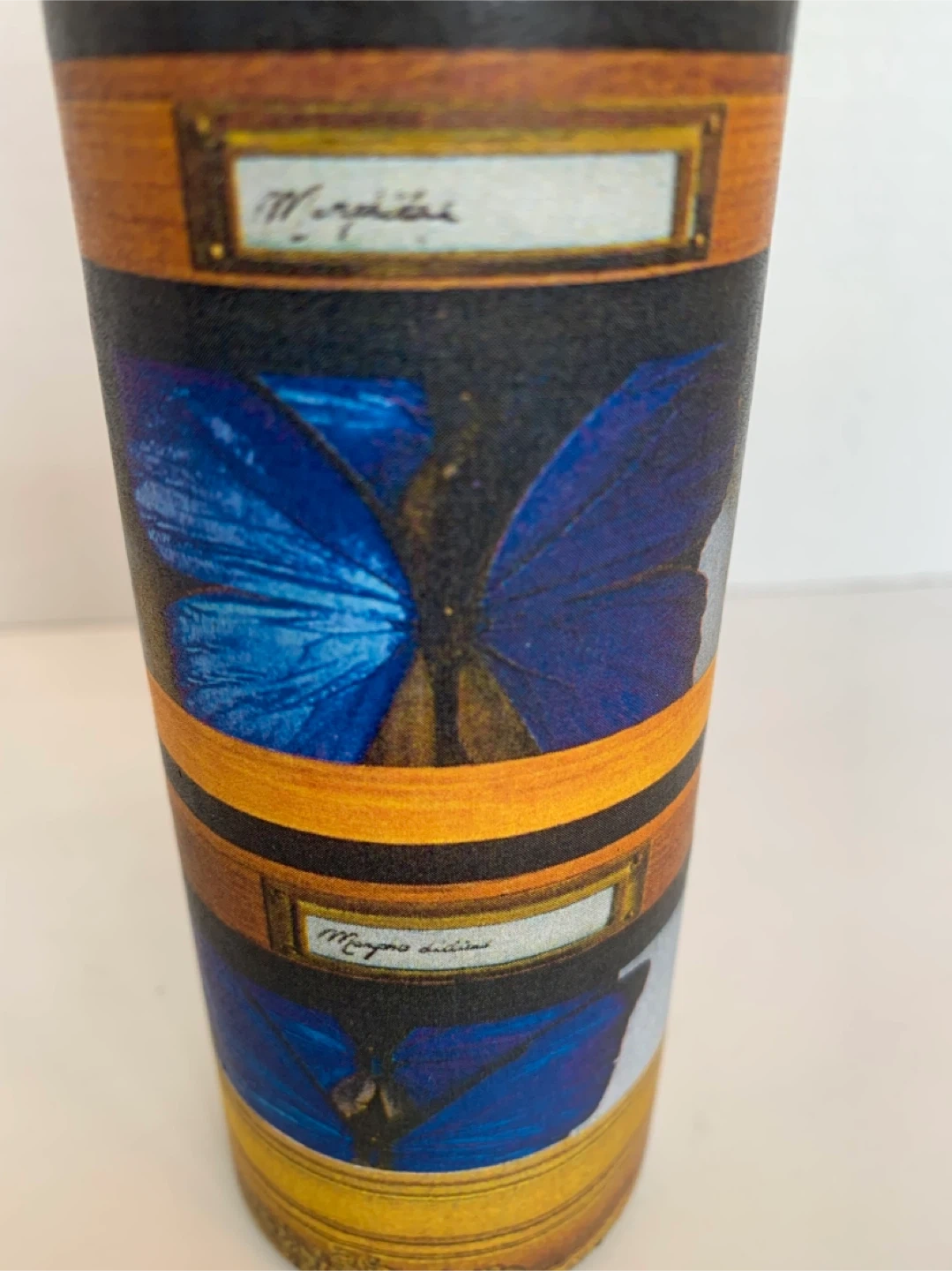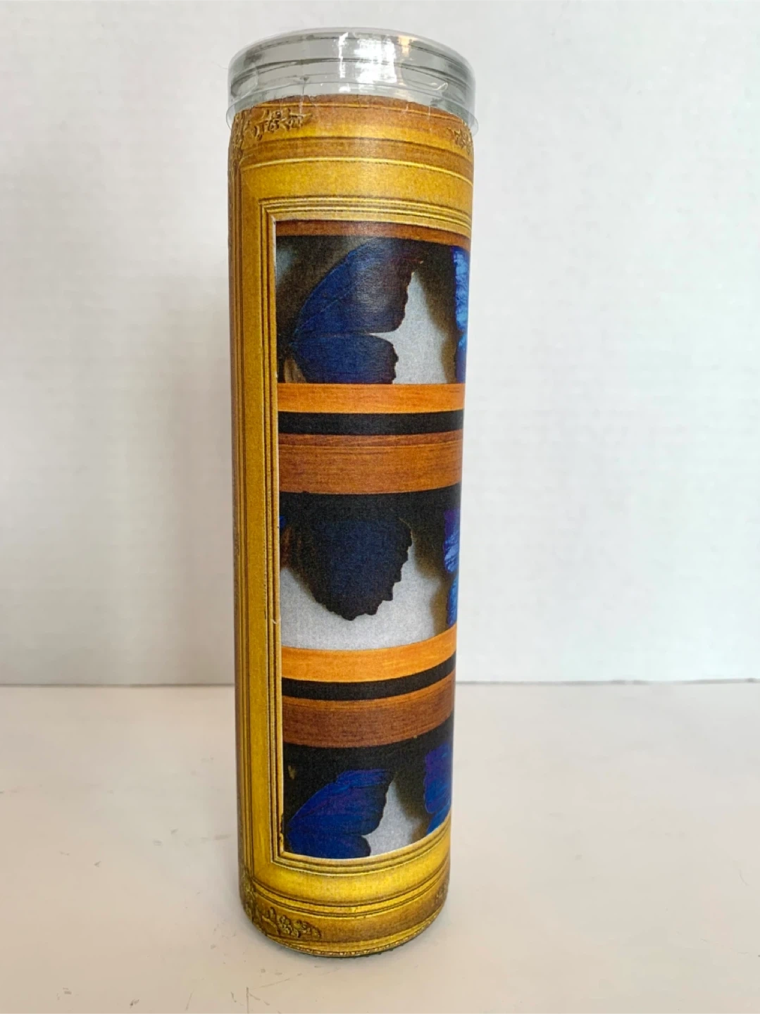 This is a decoupaged candle (by me) with a decorative wrap featuring blue butterflies in a faux display case. The glass is clear and the candle inside is white. It's a unique piece that adds a touch of nature-inspired art to any space. Perfect for someone who loves entomology or unique home decor! Image sealed for preservation.