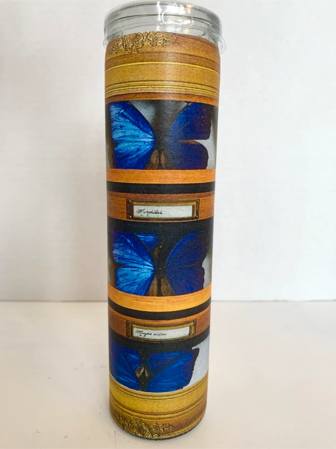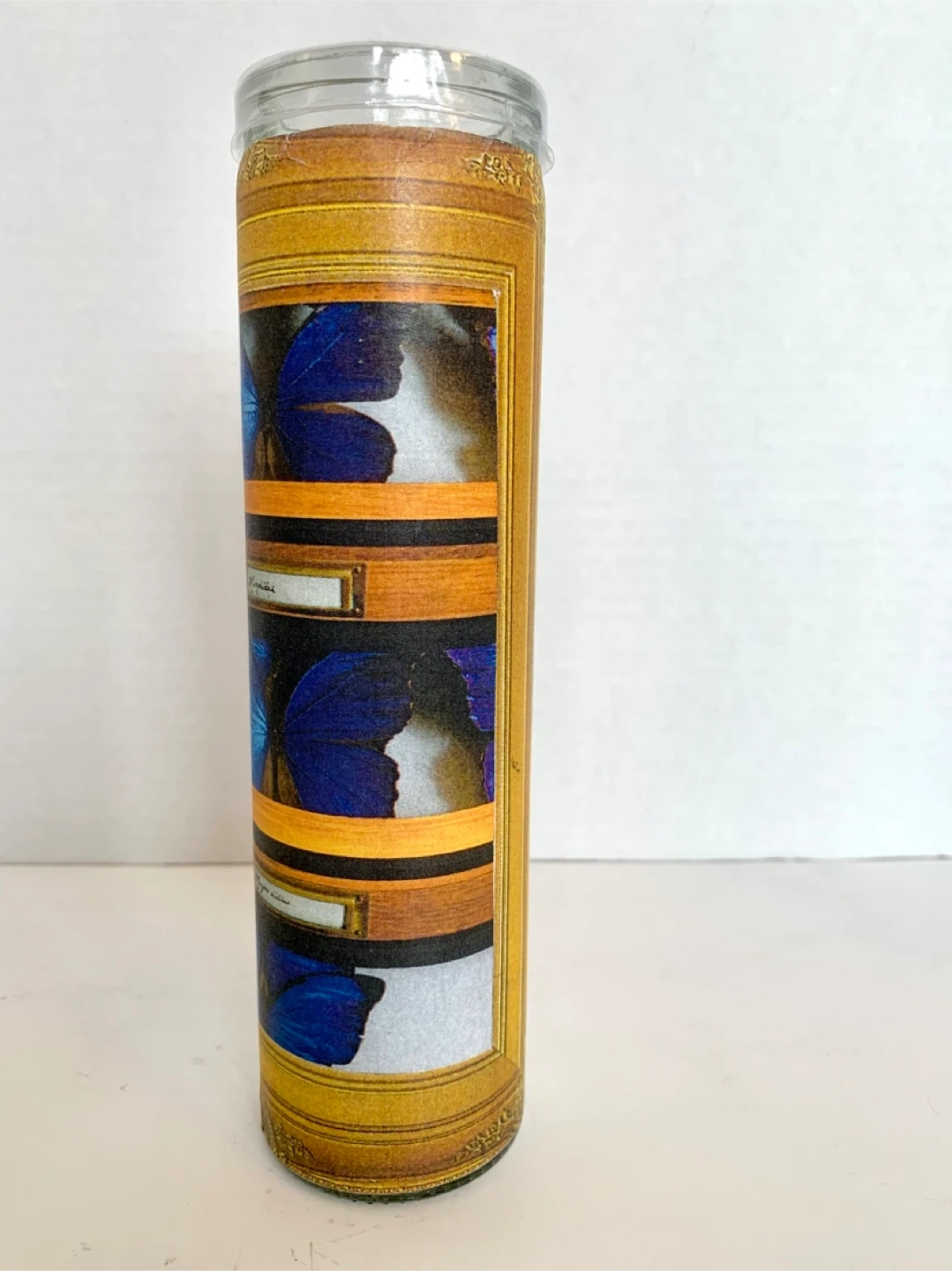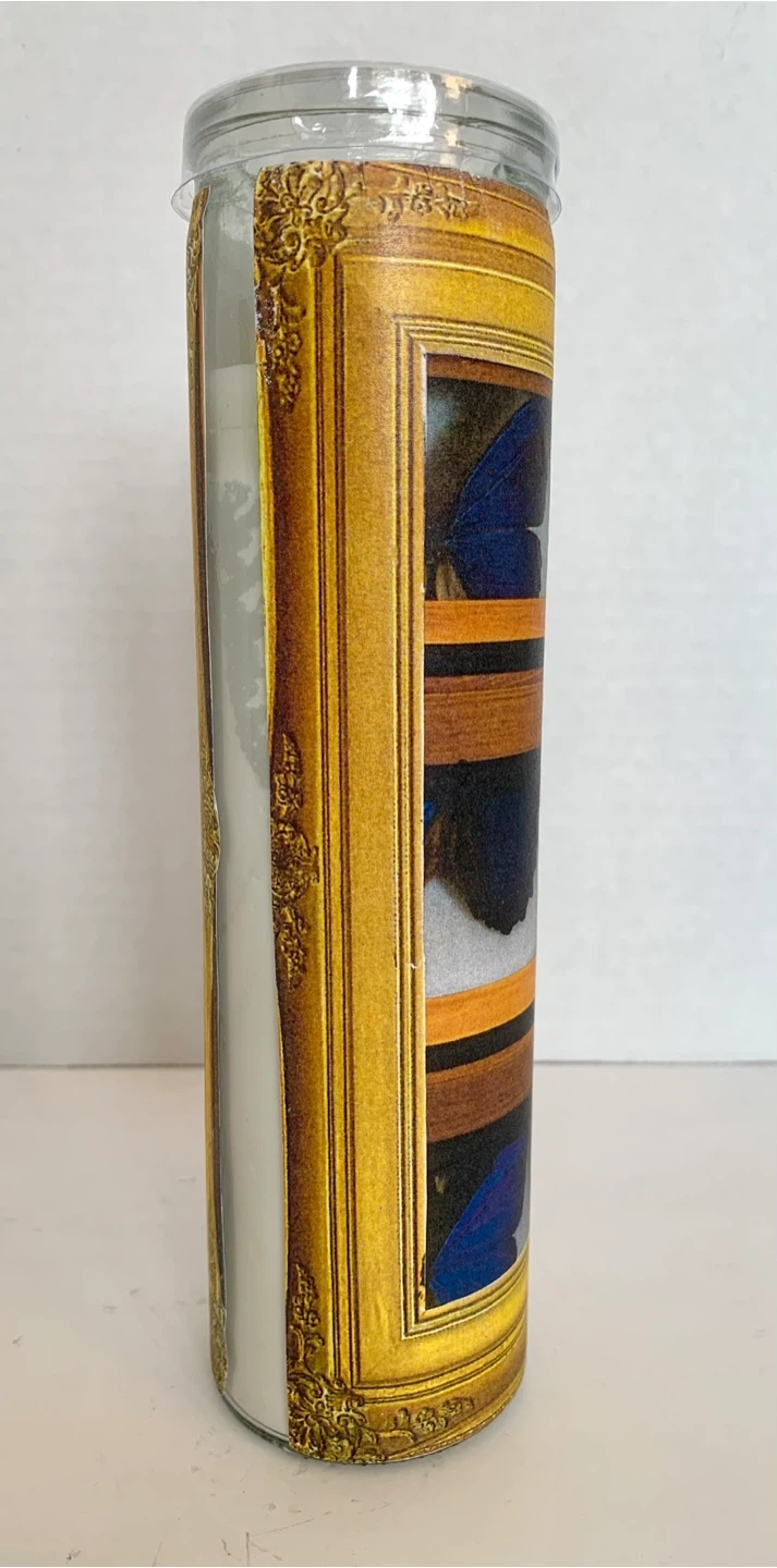 This is a decoupaged candle (by me) with a decorative wrap featuring blue butterflies in a faux display case. The glass is clear and the candle inside is white. It's a unique piece that adds a touch of nature-inspired art to any space. Perfect for someone who loves entomology or unique home decor! Image sealed for preservation.
