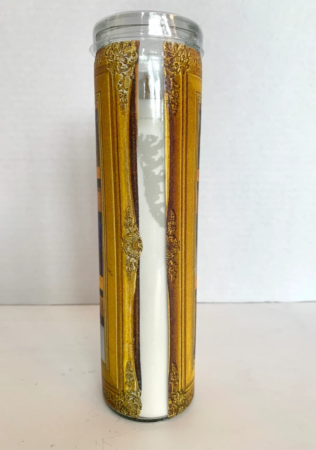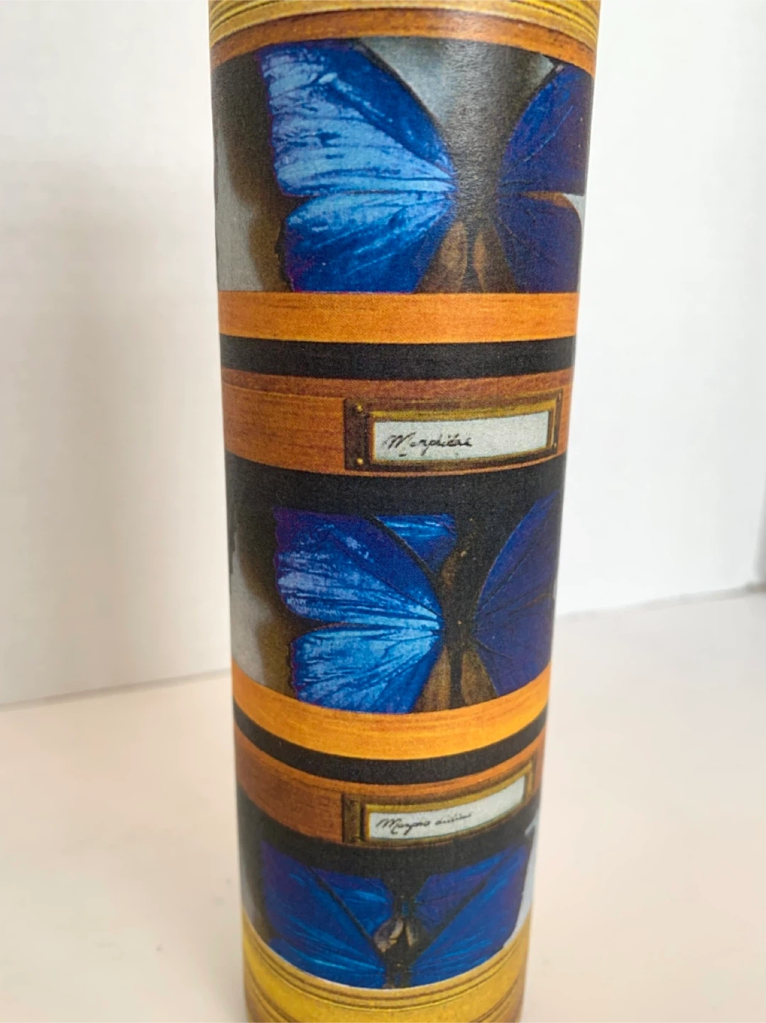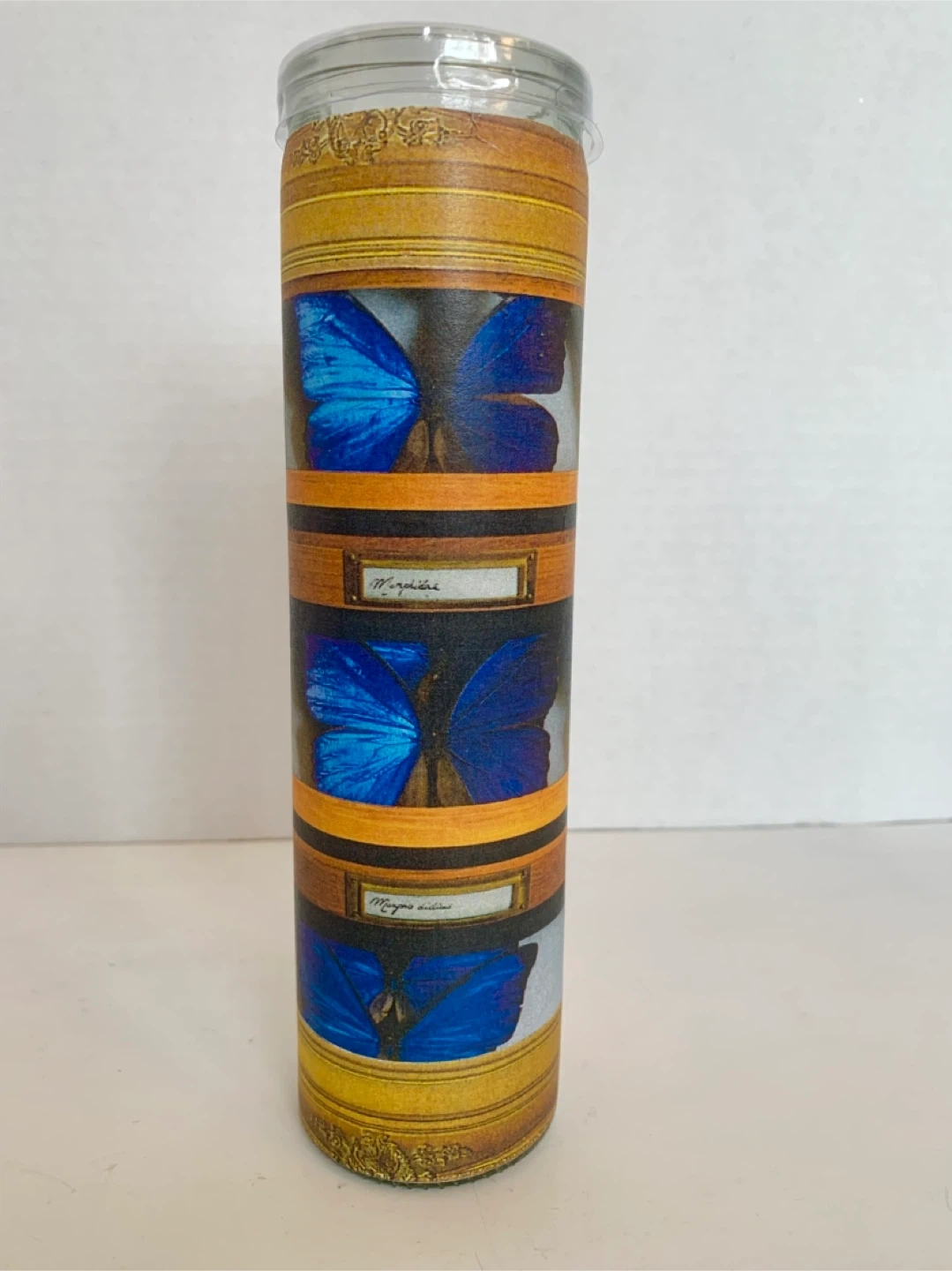 This is a decoupaged candle (by me) with a decorative wrap featuring blue butterflies in a faux display case. The glass is clear and the candle inside is white. It's a unique piece that adds a touch of nature-inspired art to any space. Perfect for someone who loves entomology or unique home decor! Image sealed for preservation.