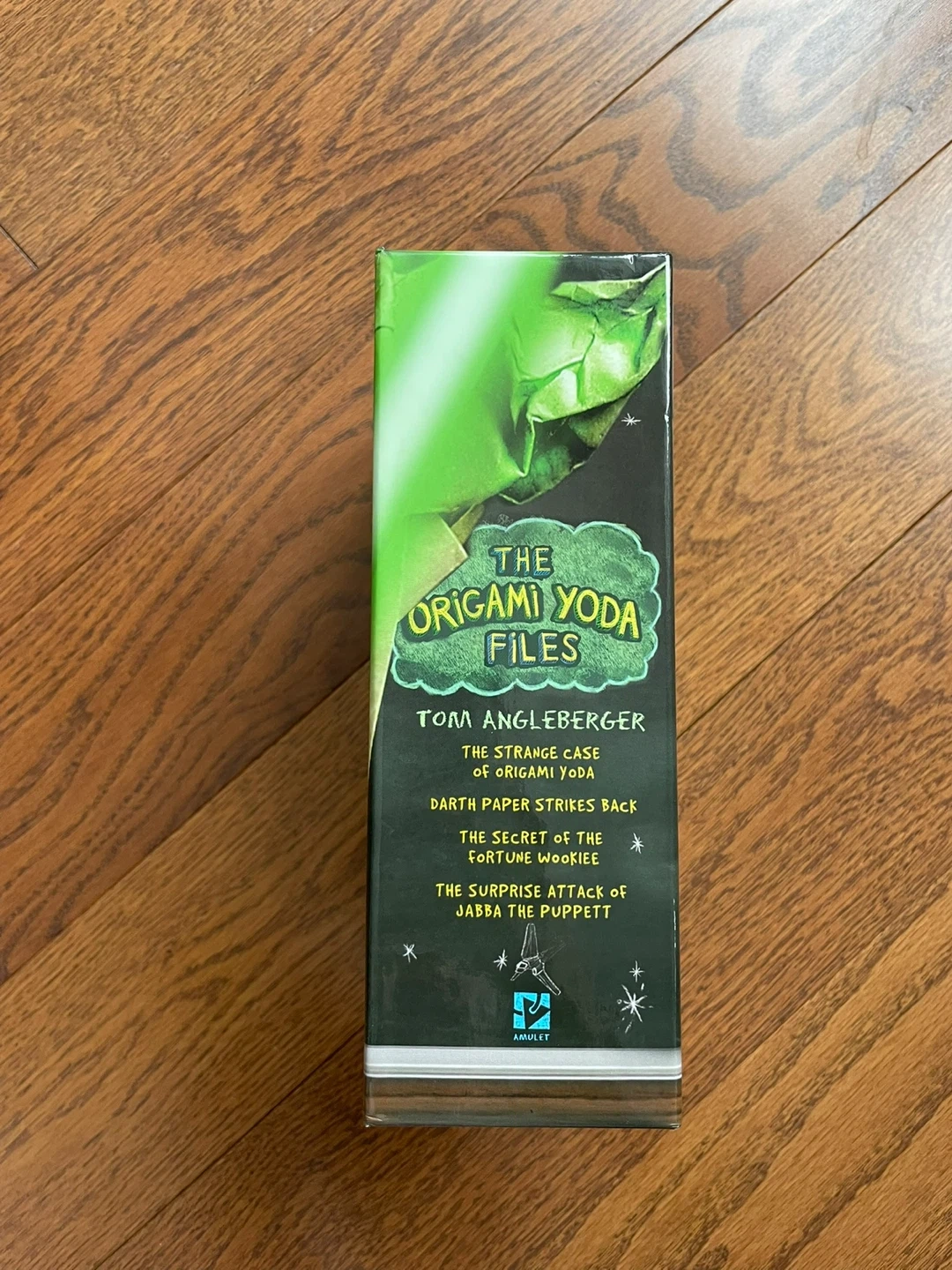 This is a set of four Origami Yoda books by Tom Angleberger, including 'The Surprise Attack of Jabba the Puppett', 'The Secret of the Fortune Wookiee', 'Darth Paper Strikes Back', and 'The Strange Case of Origami Yoda'. They are all in good condition and come in a slipcase. This collection is perfect for young readers who enjoy humour and Star Wars.