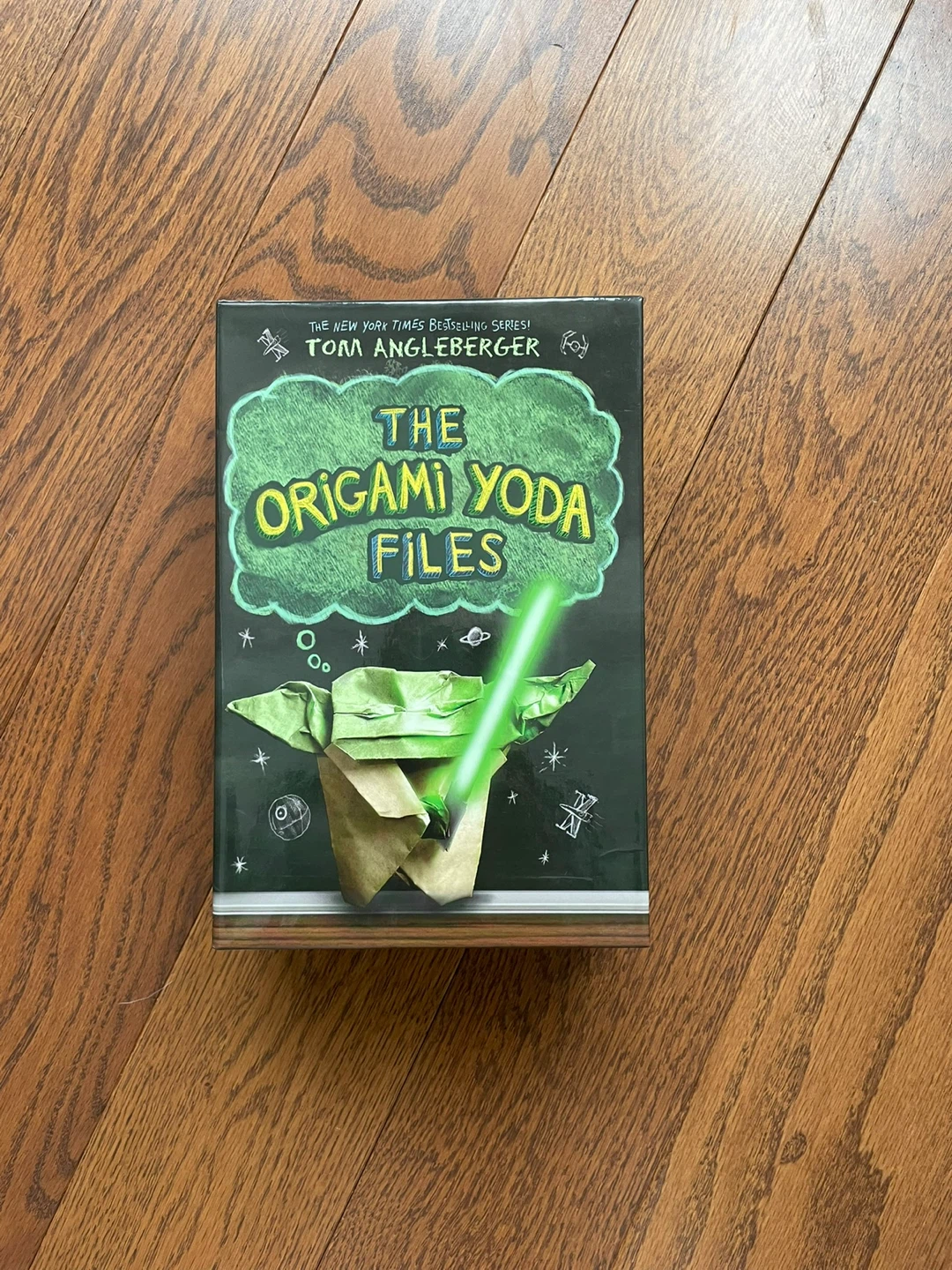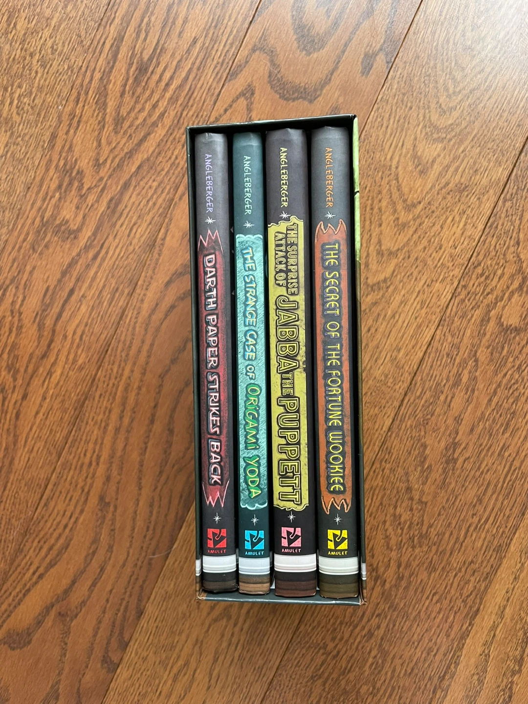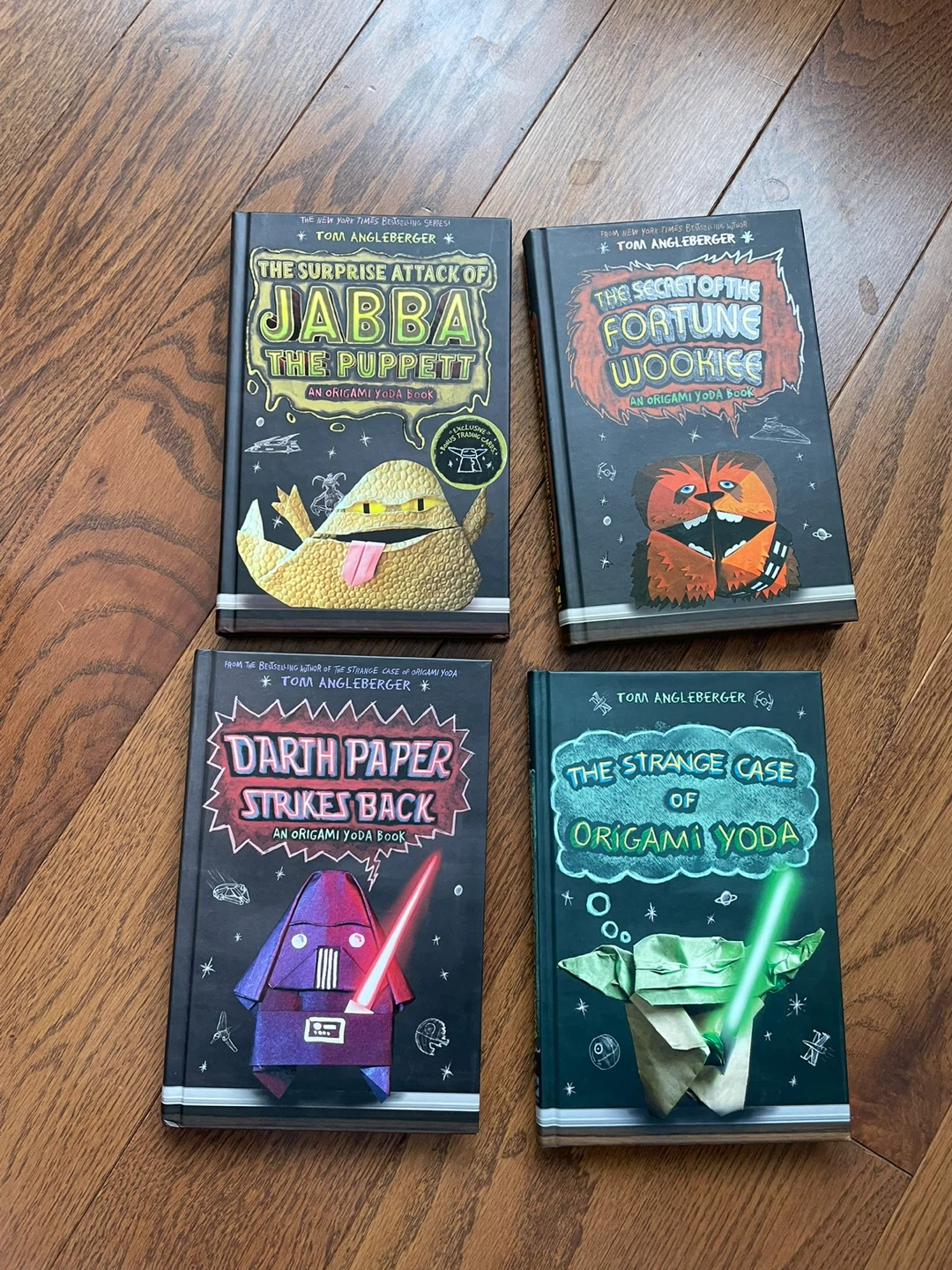 This is a set of four Origami Yoda books by Tom Angleberger, including 'The Surprise Attack of Jabba the Puppett', 'The Secret of the Fortune Wookiee', 'Darth Paper Strikes Back', and 'The Strange Case of Origami Yoda'. They are all in good condition and come in a slipcase. This collection is perfect for young readers who enjoy humour and Star Wars.