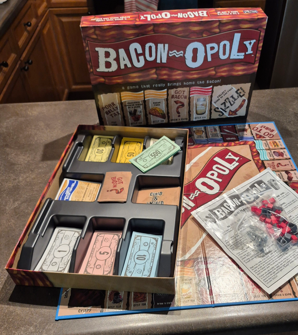 Bacon-themed board game. Includes game board, money, cards, and playing pieces. Great condition, complete set.