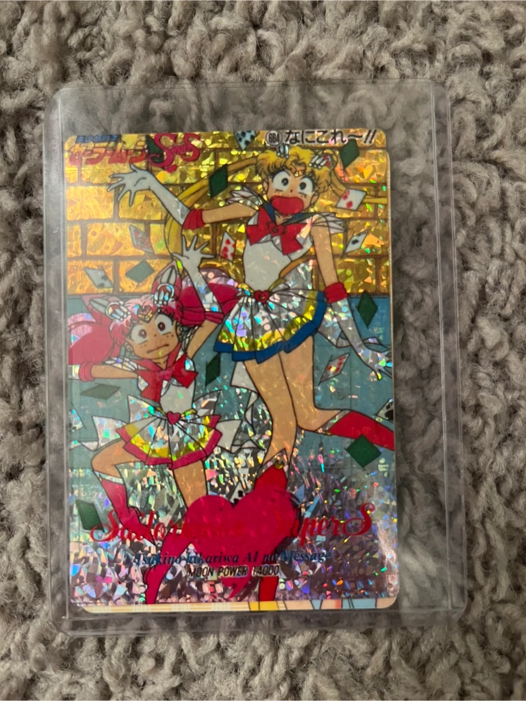 This is a holographic Sailor Moon trading card featuring Sailor Moon and Sailor Chibi Moon. It has "MOON POWER 14000" printed on it. It's a collectible item for fans of the series.