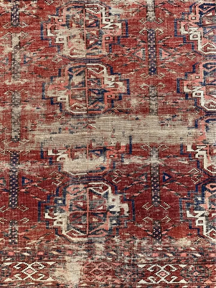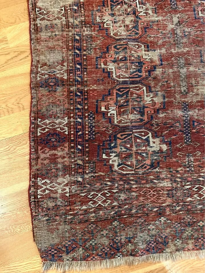 For your consideration is an authentic Turkoman tribal rug with deep history. At 41 x 49 inches, this is a versatile size, perfect for a unique wall hanging, a textile throw, or a low-traffic accent piece. This rug is for the collector who appreciates beauty in the weathered and aged. It has seen generations of use and possesses a heavily distressed, antique patina. Like the ancient Pazyryk rug, its value lies in its survival and artistry, not its perfection. Features traditional Turkoman "gul" medallions in rich, naturally aged dyes. Due to its supple, worn state, it drapes beautifully. It is ideal for mounting as a wall tapestry, framing, or layering over the back of a leather sofa for an instant library/den vibe. A true conversation piece for those who prefer items with a story. Dimensions: 41" x 49". Condition: Heavily worn/Antique. This piece is being sold as a decorative textile/art fragment. Please see photos for the beautiful wear and thinning that give it its unique character. Price: $100. Pickup: Bucktown (Chicago).