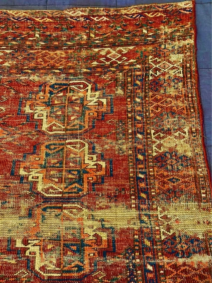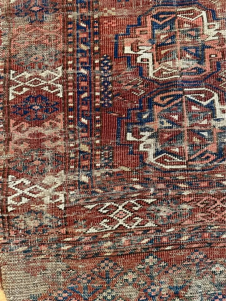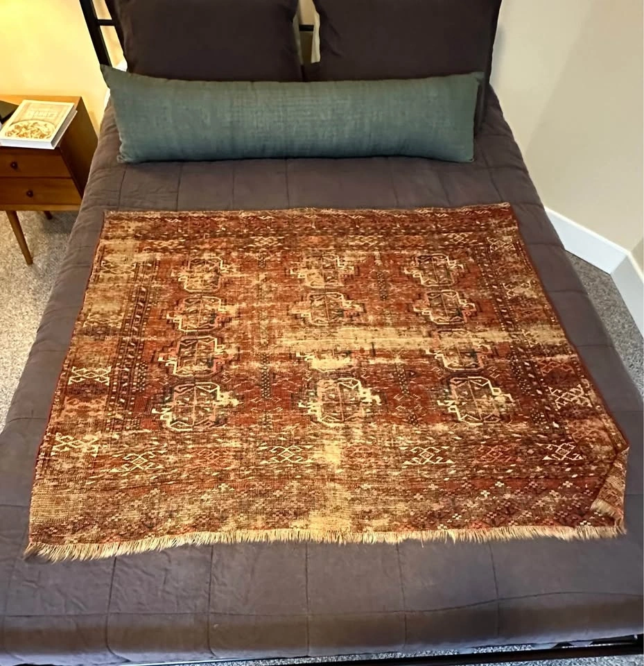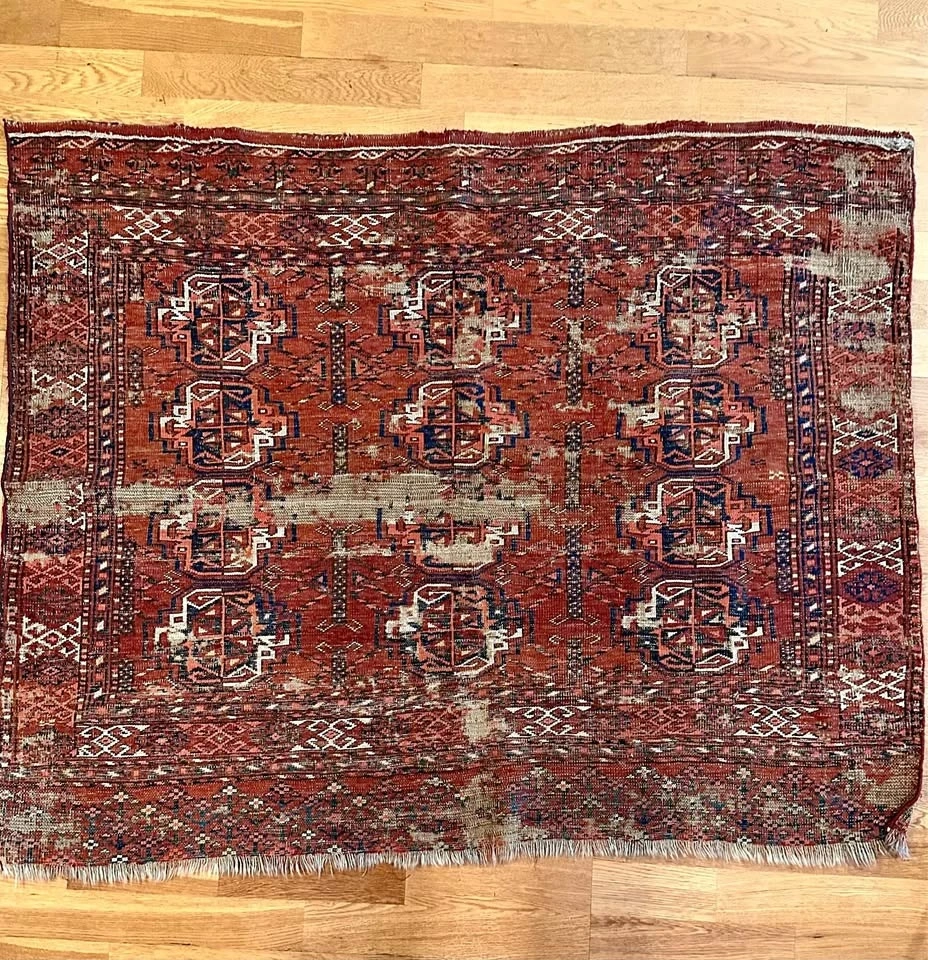 For your consideration is an authentic Turkoman tribal rug with deep history. At 41 x 49 inches, this is a versatile size, perfect for a unique wall hanging, a textile throw, or a low-traffic accent piece. This rug is for the collector who appreciates beauty in the weathered and aged. It has seen generations of use and possesses a heavily distressed, antique patina. Like the ancient Pazyryk rug, its value lies in its survival and artistry, not its perfection. Features traditional Turkoman "gul" medallions in rich, naturally aged dyes. Due to its supple, worn state, it drapes beautifully. It is ideal for mounting as a wall tapestry, framing, or layering over the back of a leather sofa for an instant library/den vibe. A true conversation piece for those who prefer items with a story. Dimensions: 41" x 49". Condition: Heavily worn/Antique. This piece is being sold as a decorative textile/art fragment. Please see photos for the beautiful wear and thinning that give it its unique character. Price: $100. Pickup: Bucktown (Chicago).