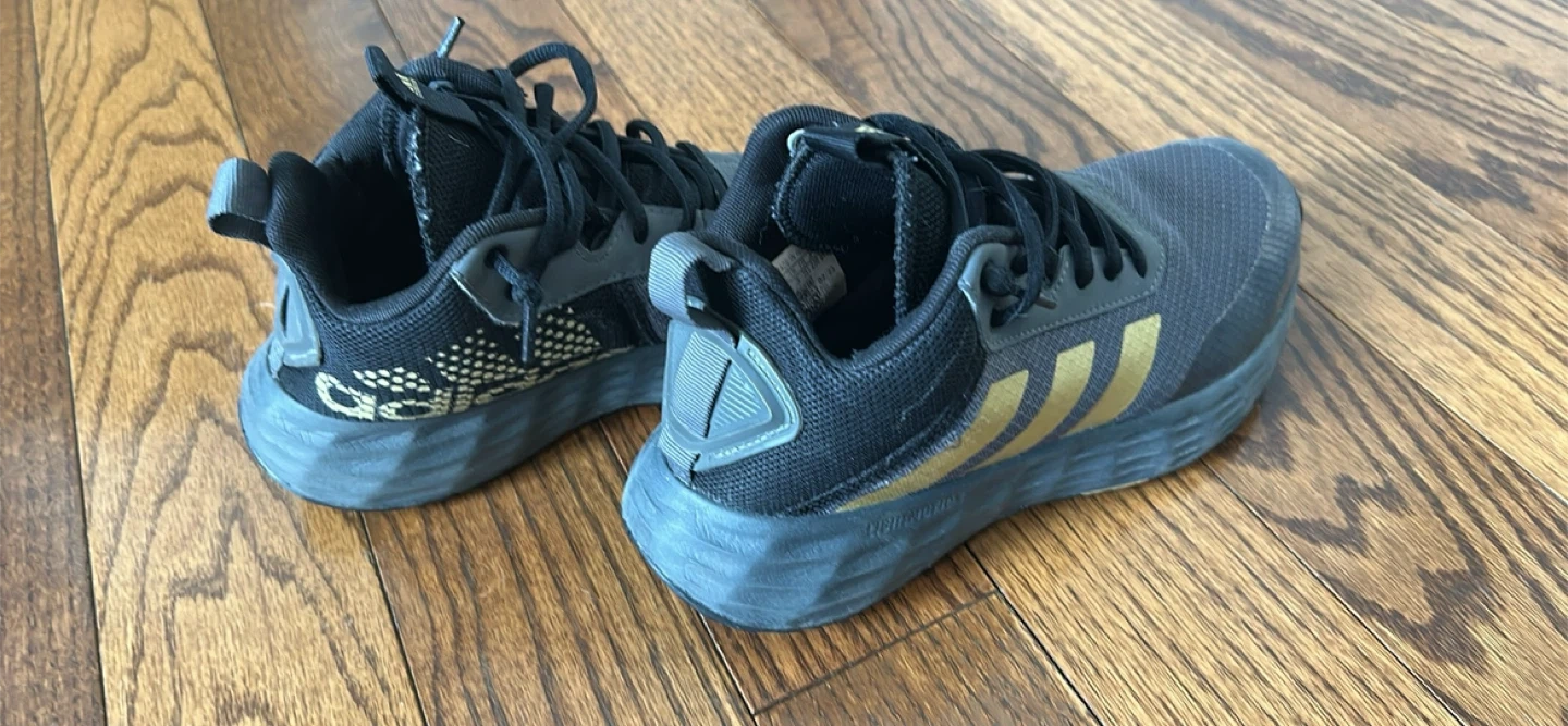 Selling a pair of Adidas Duramo running shoes in black with gold stripes! They're lightweight and great for running or everyday wear. The shoes are in good condition and ready for a new owner