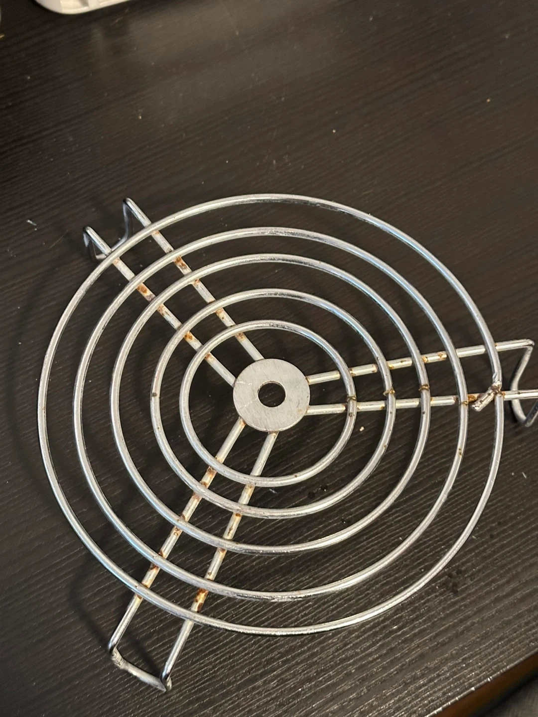 This is a round metal cooling rack. It's made of metal with a silver finish and has visible signs of rust. It's useful for cooling baked goods.