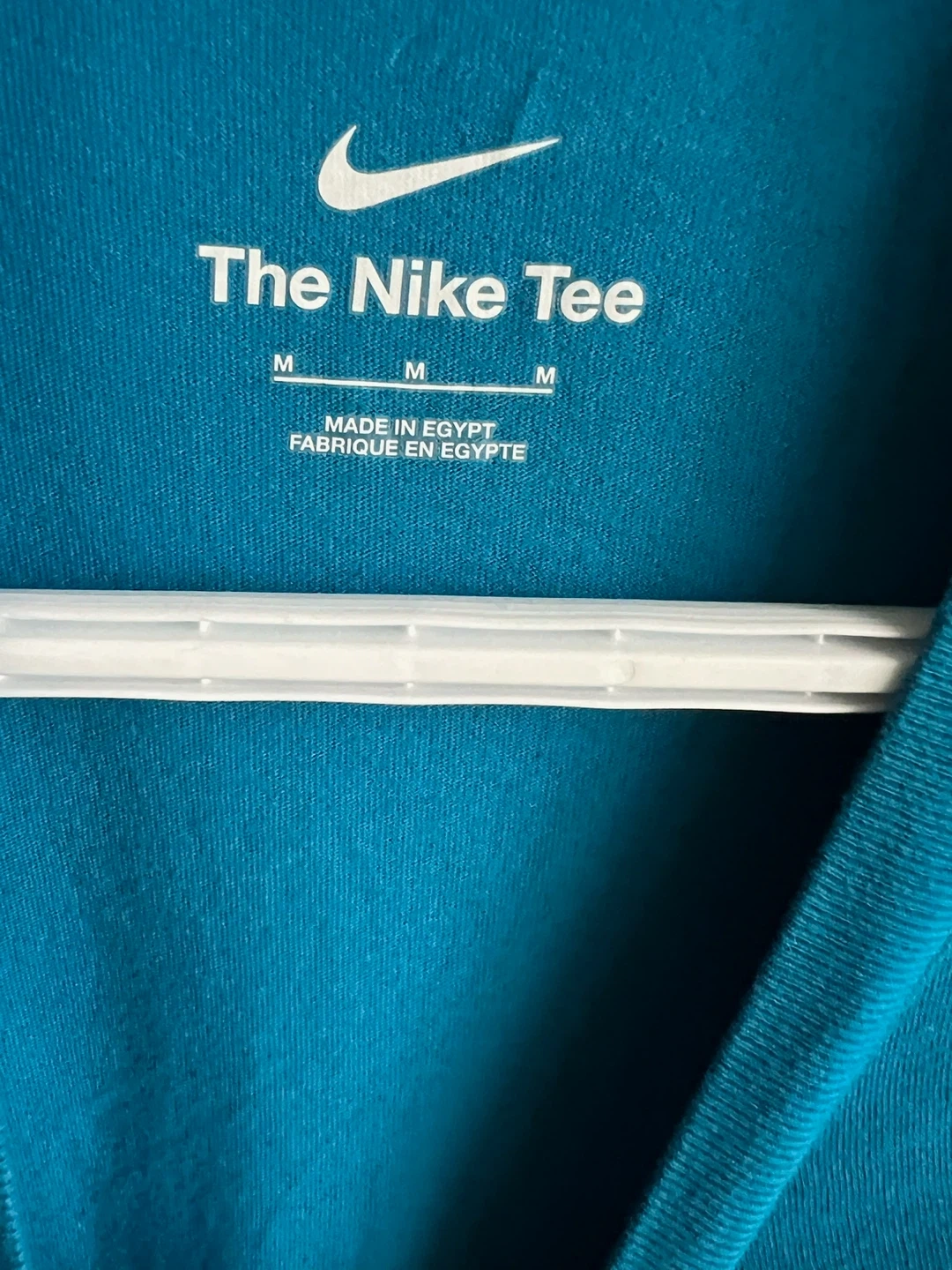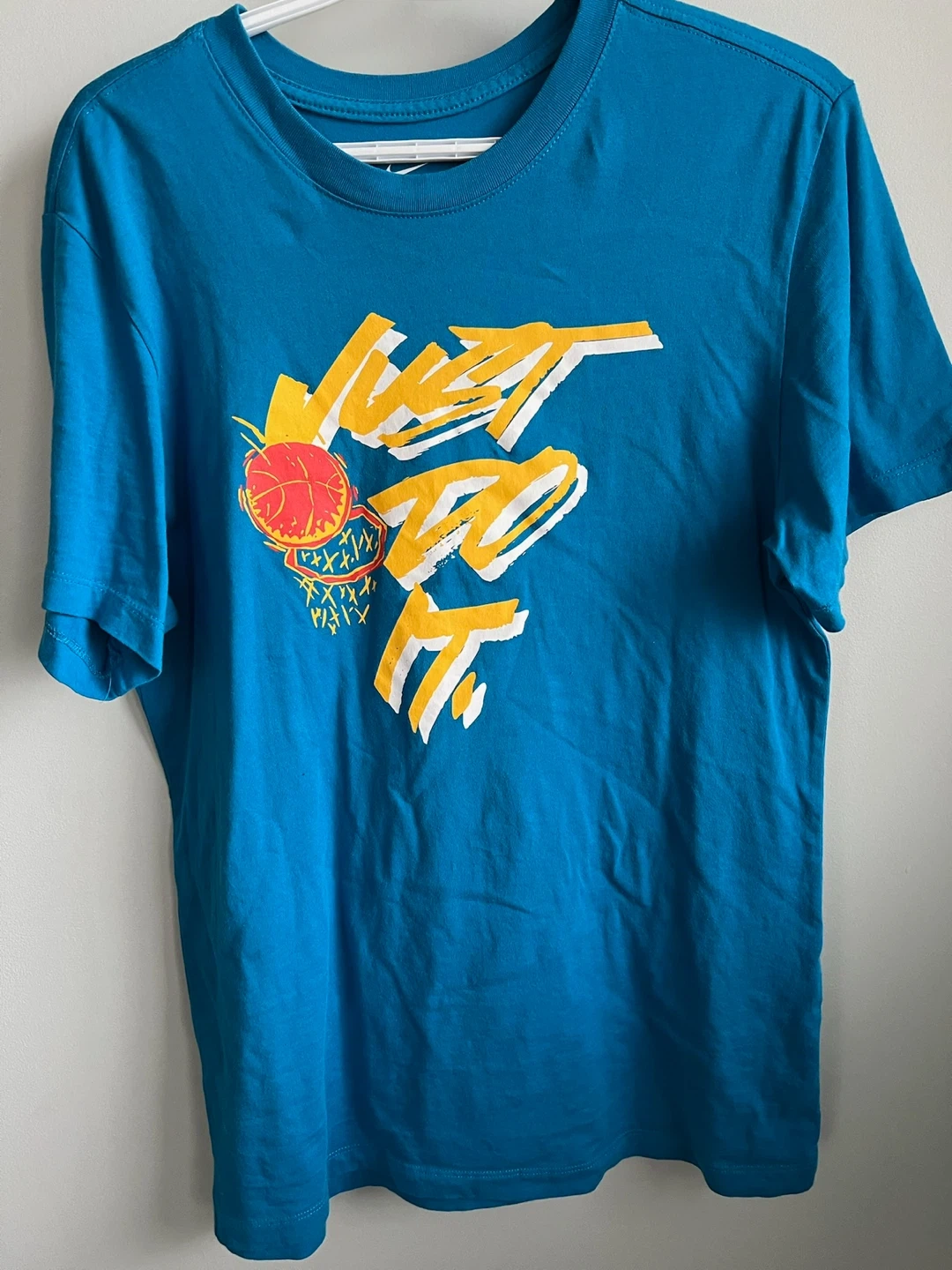 This is The Nike Tee in a bright teal colour. It features a fun graphic with a basketball and the "Just Do It" slogan. Made in Egypt. It's a size medium.