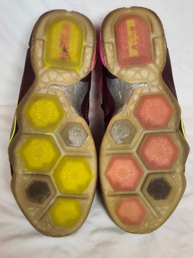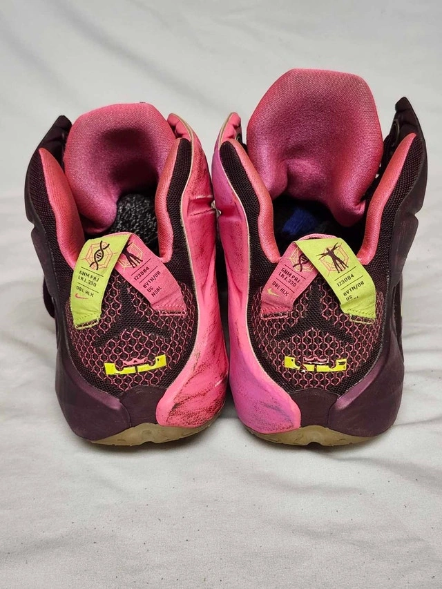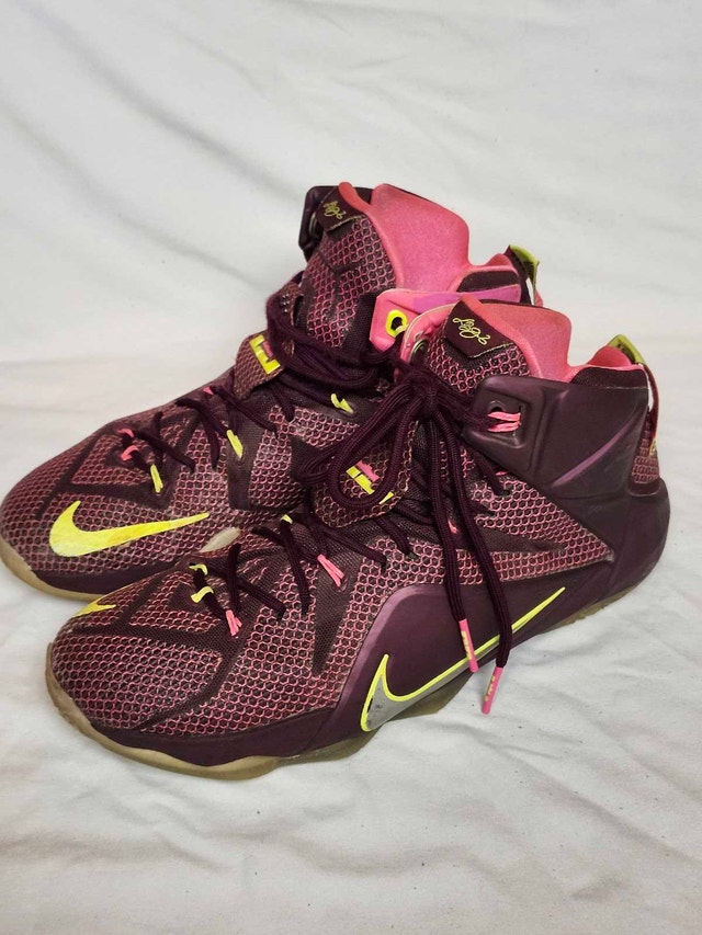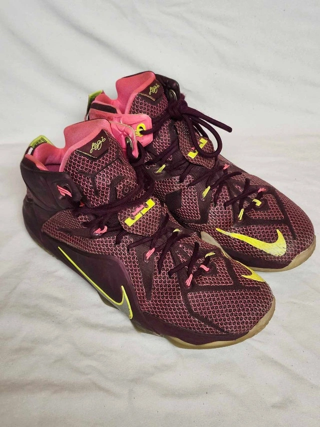 Pre-owned LeBron 12 "Double Helix" basketball shoes in men's size 11 US. These sneakers feature a unique colourway with a blend of burgundy, pink, and volt accents, offering both style and performance on the court. Showing signs of wear but still in good shape for playing ball! Cash accepted.