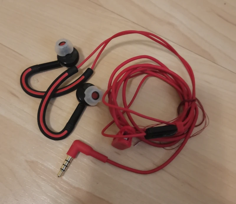 These red in-ear earbuds are designed for active use with secure over-ear hooks. They feature a standard 3.5mm audio jack and an inline microphone. These earbuds are great for workouts or everyday listening!