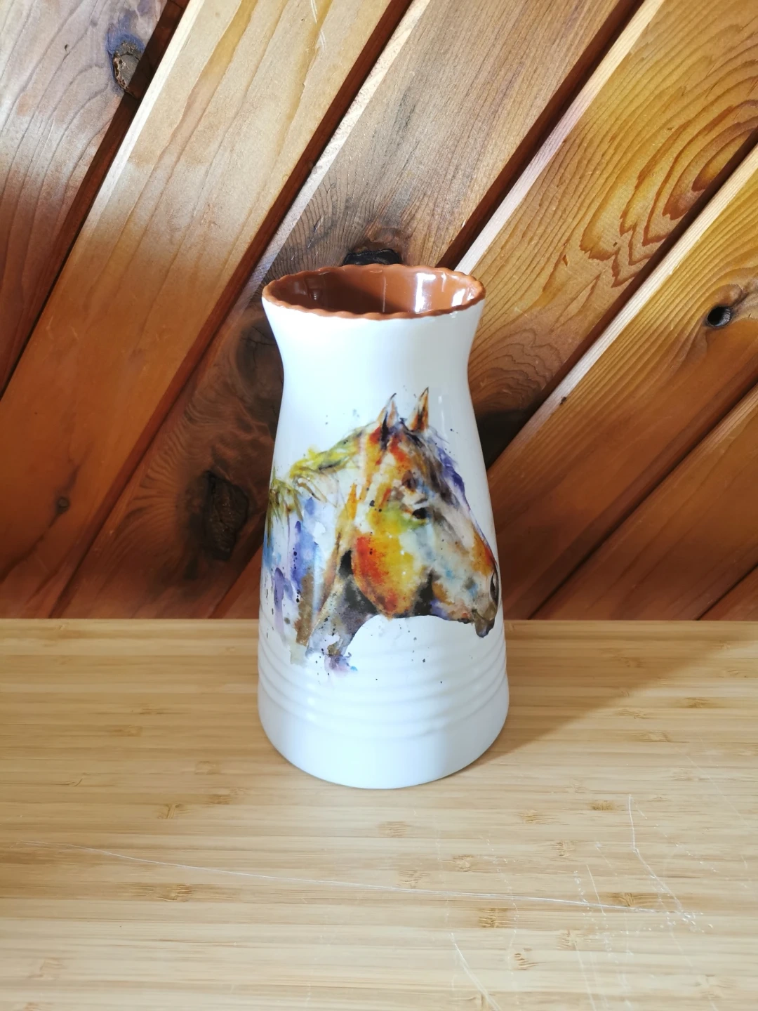 Beautiful stoneware vase featuring a vibrant watercolor-style horse design by artist Dean Crouser. Dean Crouser is known for vibrant, loose watercolor-style wildlife art inspired by nature, fishing, and the outdoors. His designs are widely licensed onto home decor like mugs, vases, and wall art.