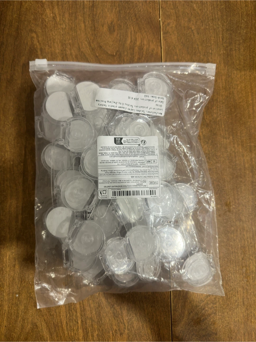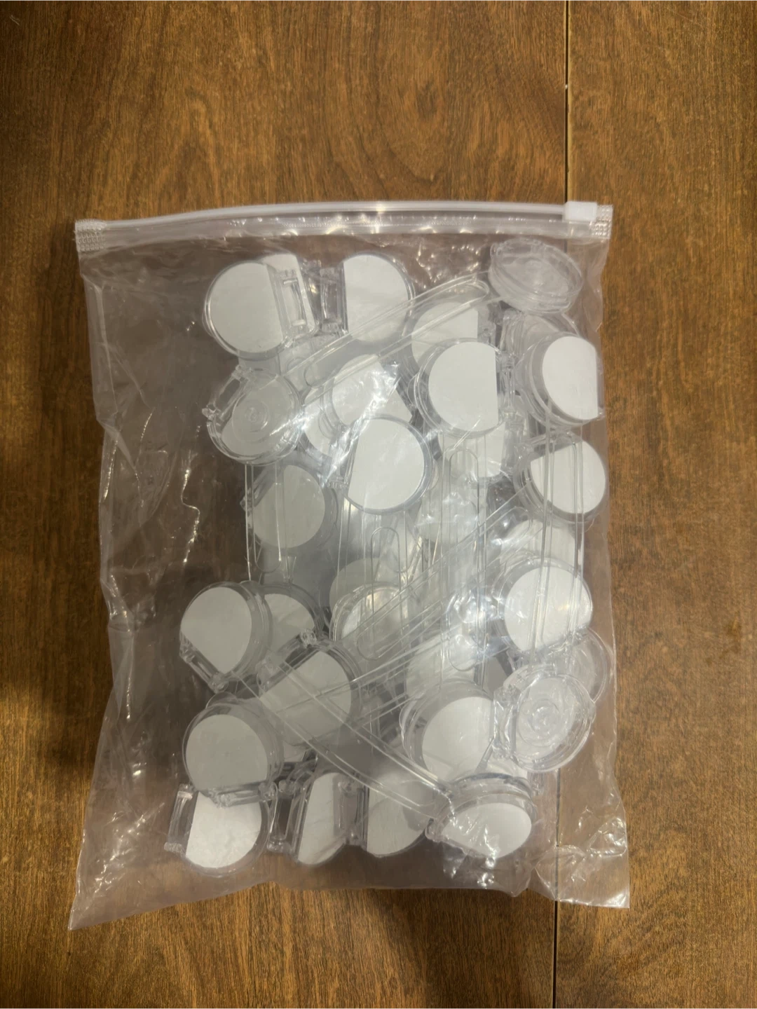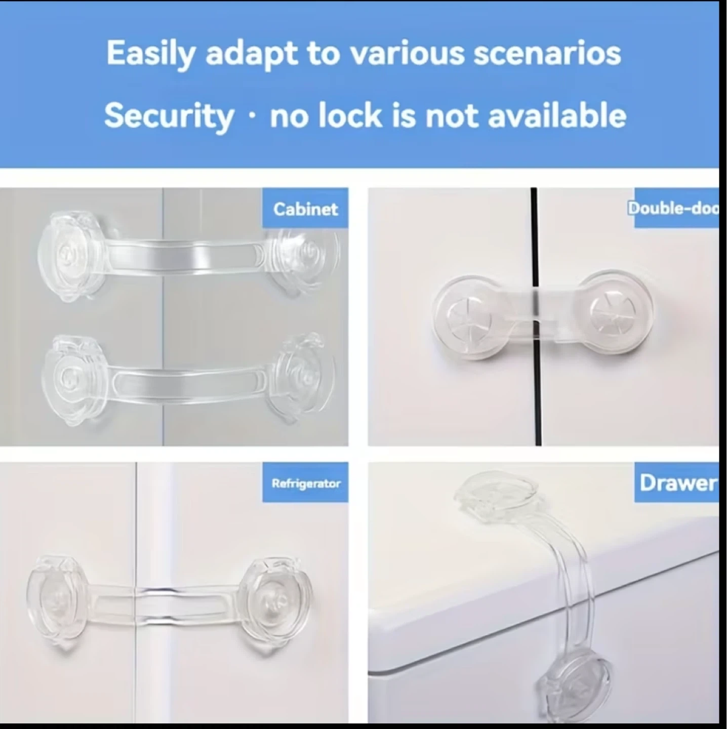Bag of 20 pack clear plastic child safety locks for cabinets, drawers, and refrigerators. These locks feature an adhesive backing for easy installation and removal. They're designed to help keep little ones safe around the house. Easy to use for adults!