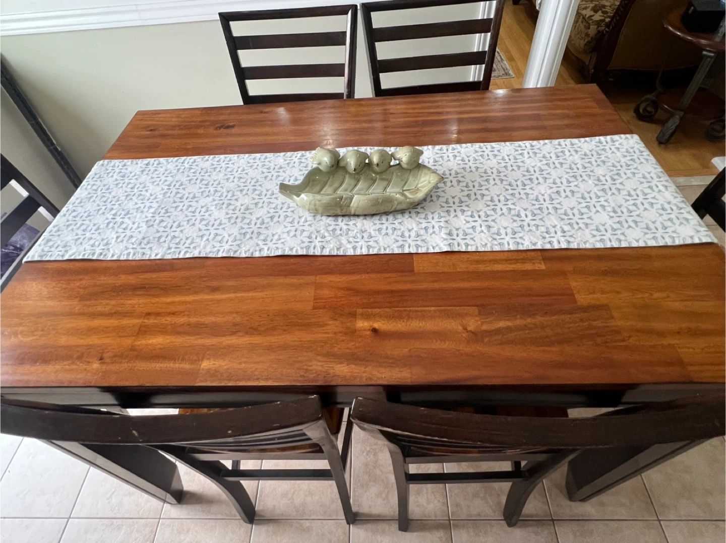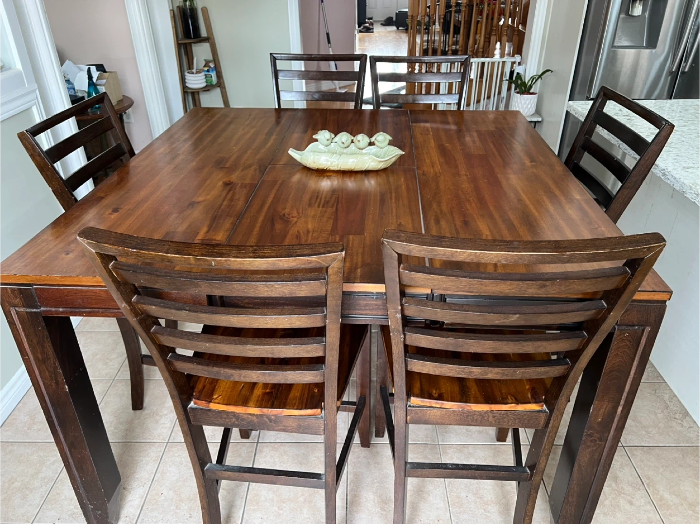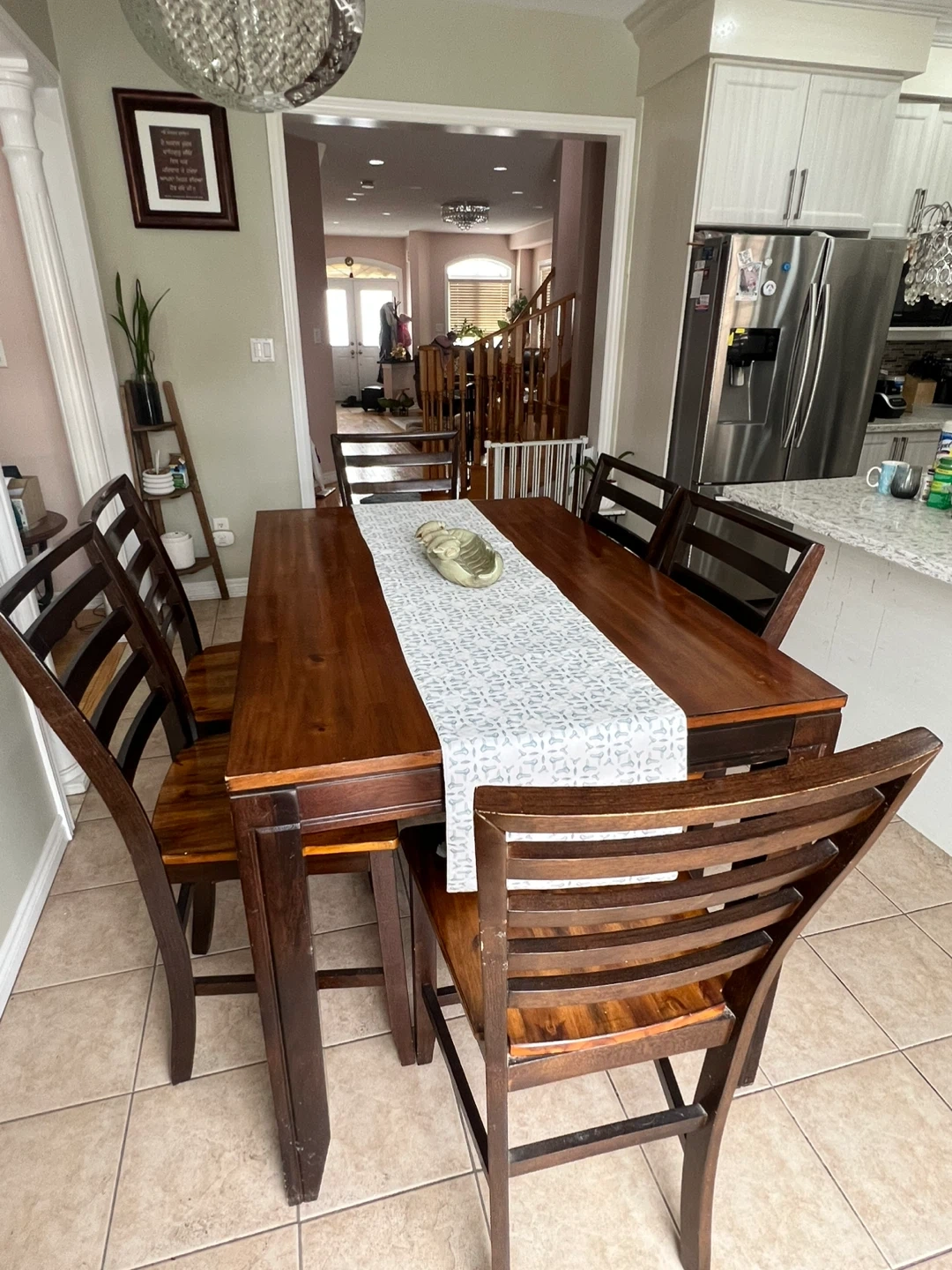 Beautiful solid wood dining table, seats six comfortably. It's a warm, dark brown wood with a smooth finish. Includes six matching slatted-back chairs. Originally bought from ‘The Brick’ Perfect for family dinners or entertaining guests!