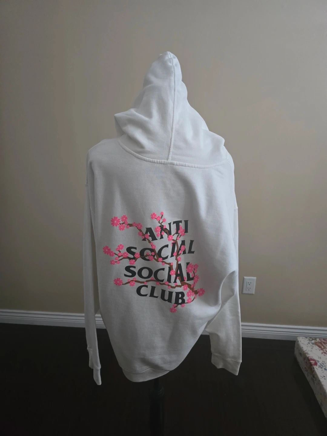 This is a white hoodie from Anti Social Social Club, featuring a cherry blossom graphic on the back and logo on the front. It has a comfortable hood and a front pocket. Cotton blend material. Never worm