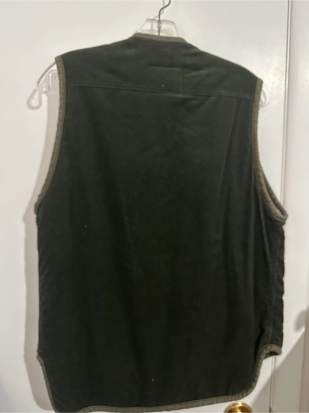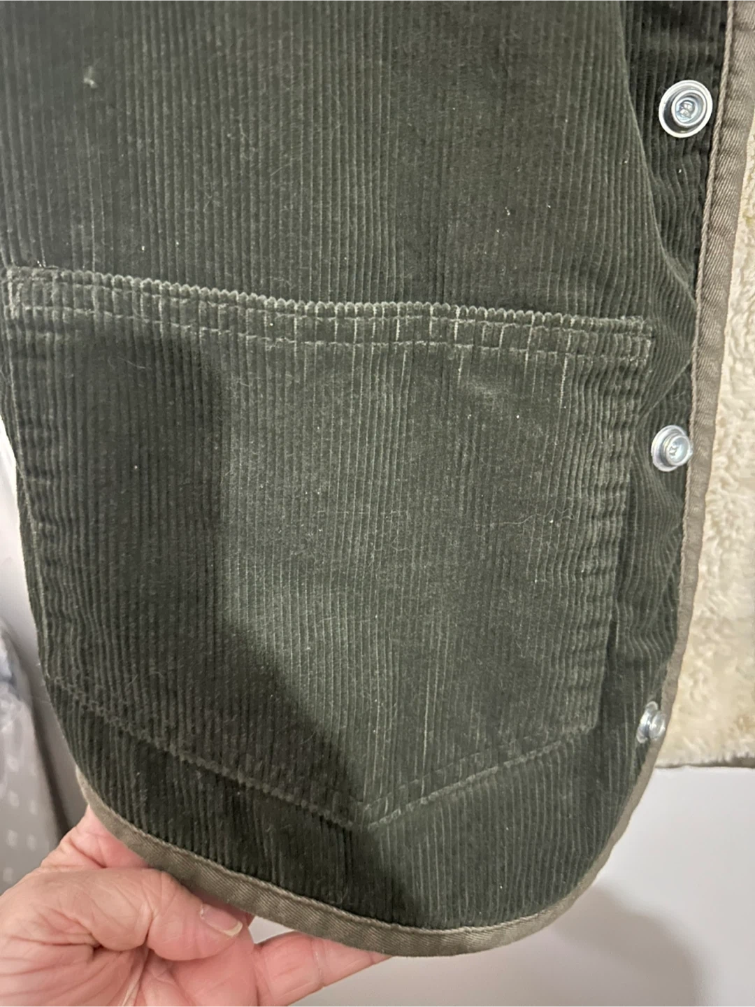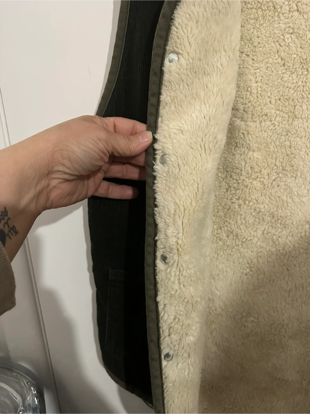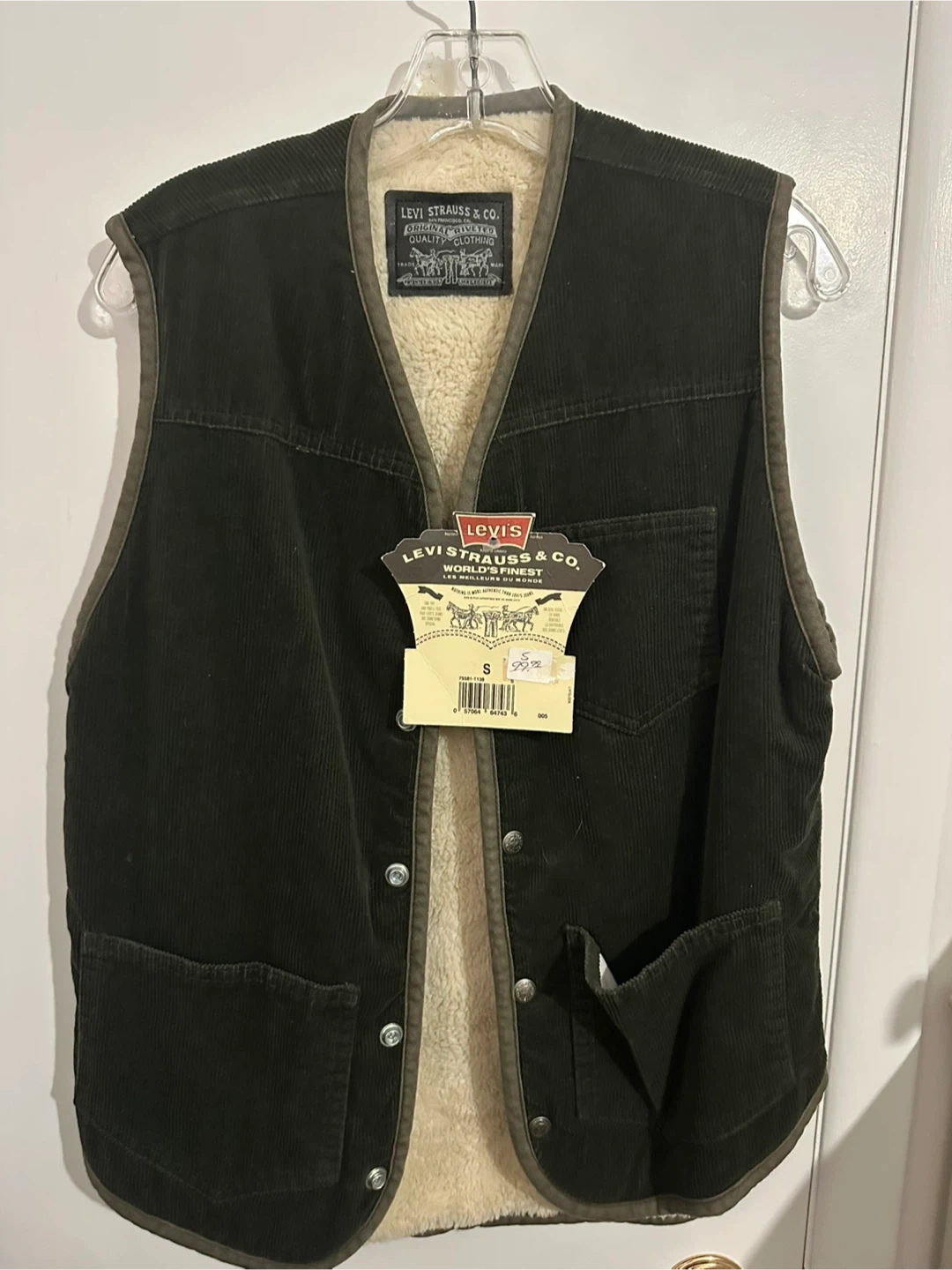 This is a Levi's sherpa lined corduroy vest. It's dark green with a full button-up front. Size is small. This vest is great for layering on cooler days! Brand new with tags, never worn, all buttons are functional and secure.