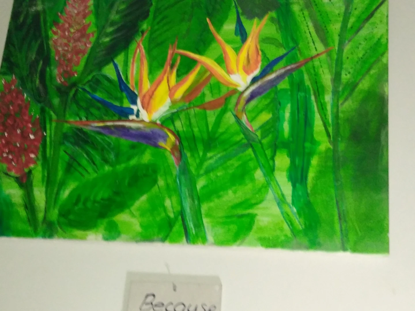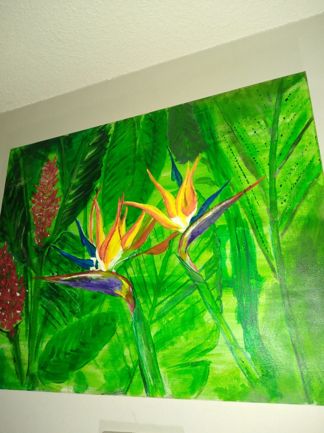 This is a one-of-a-kind painted by the artist just from my house and it is of Red Ginger Hawaiian flower and also bird of paradise Hawaiian flower it's very very exquisite and very well done. A real statement piece
