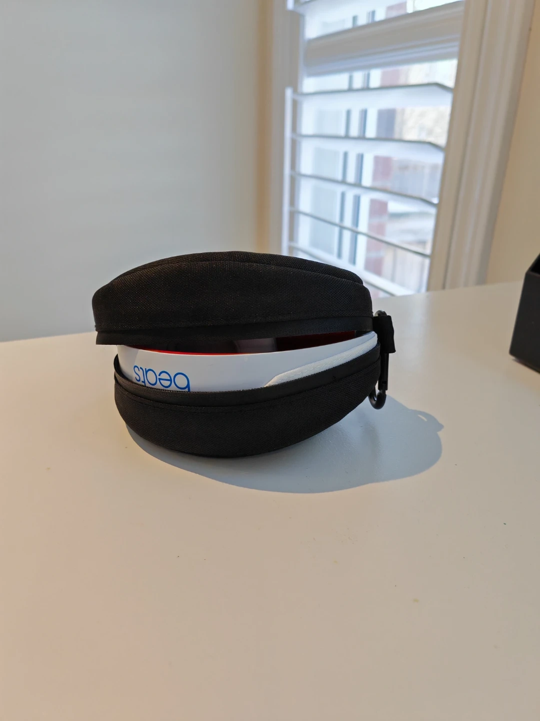 These are Beats Solo3 wireless on-ear headphones in white with red accents. They connect wirelessly, come with a charging cable and a case. Rarely used, in very good condition.