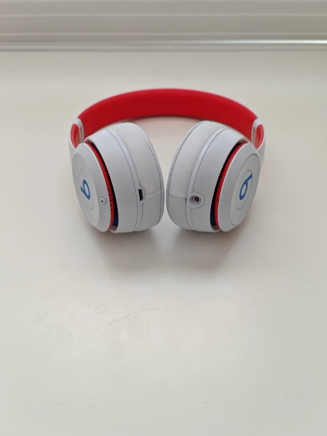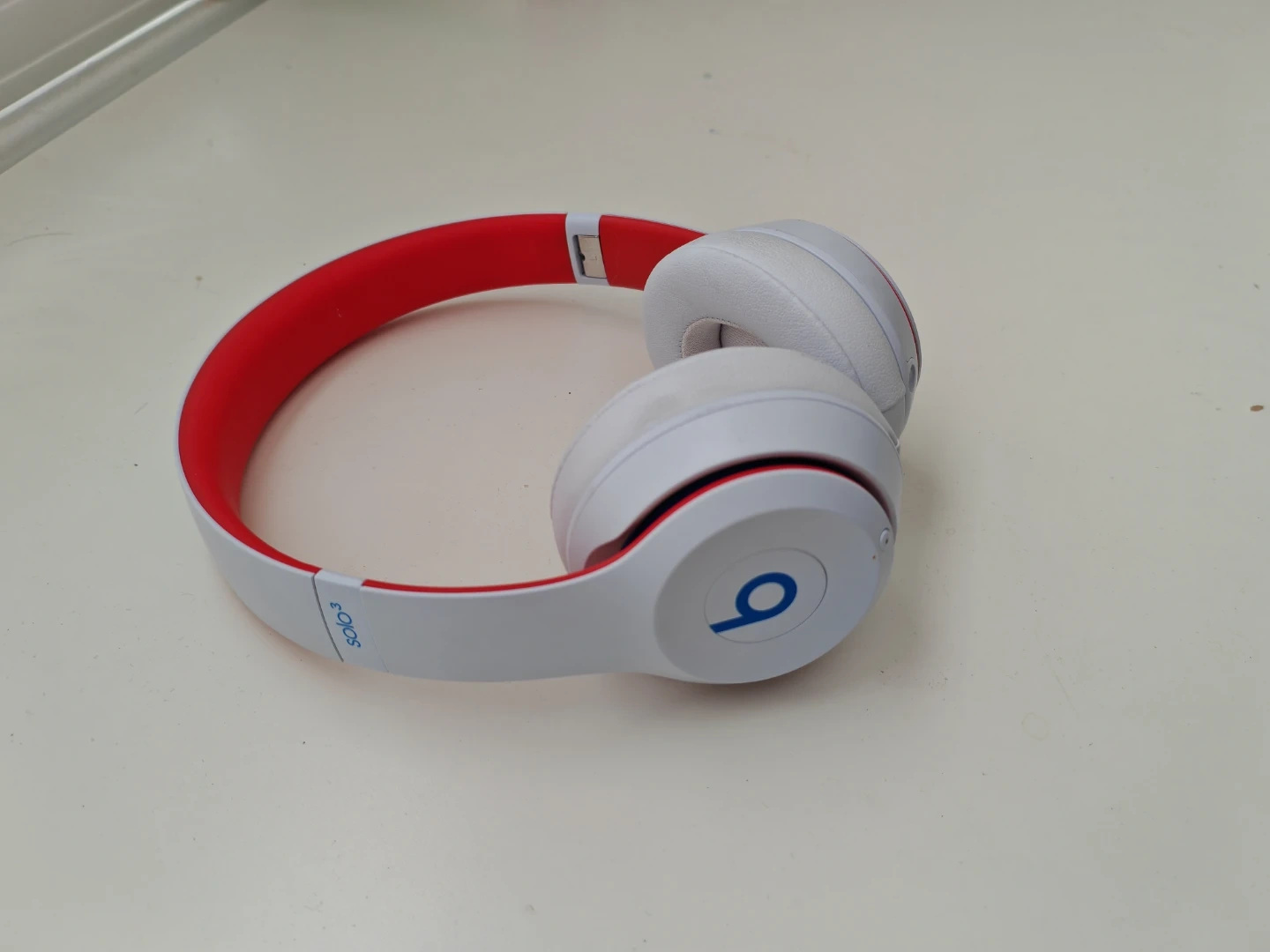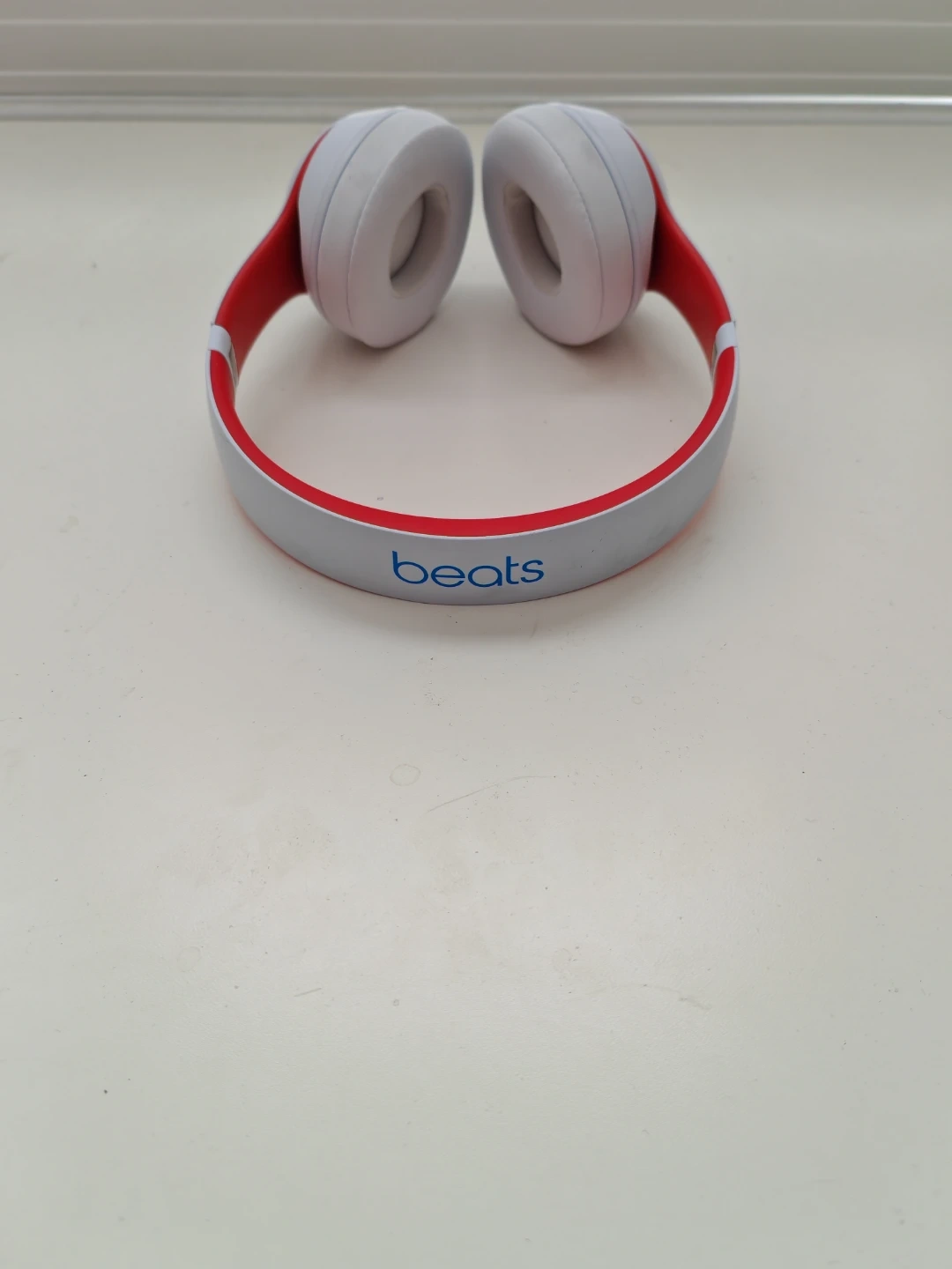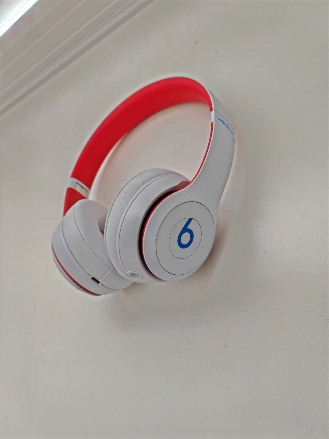These are Beats Solo3 wireless on-ear headphones in white with red accents. They connect wirelessly and come with a charging cable. Rarely used, in very good condition.