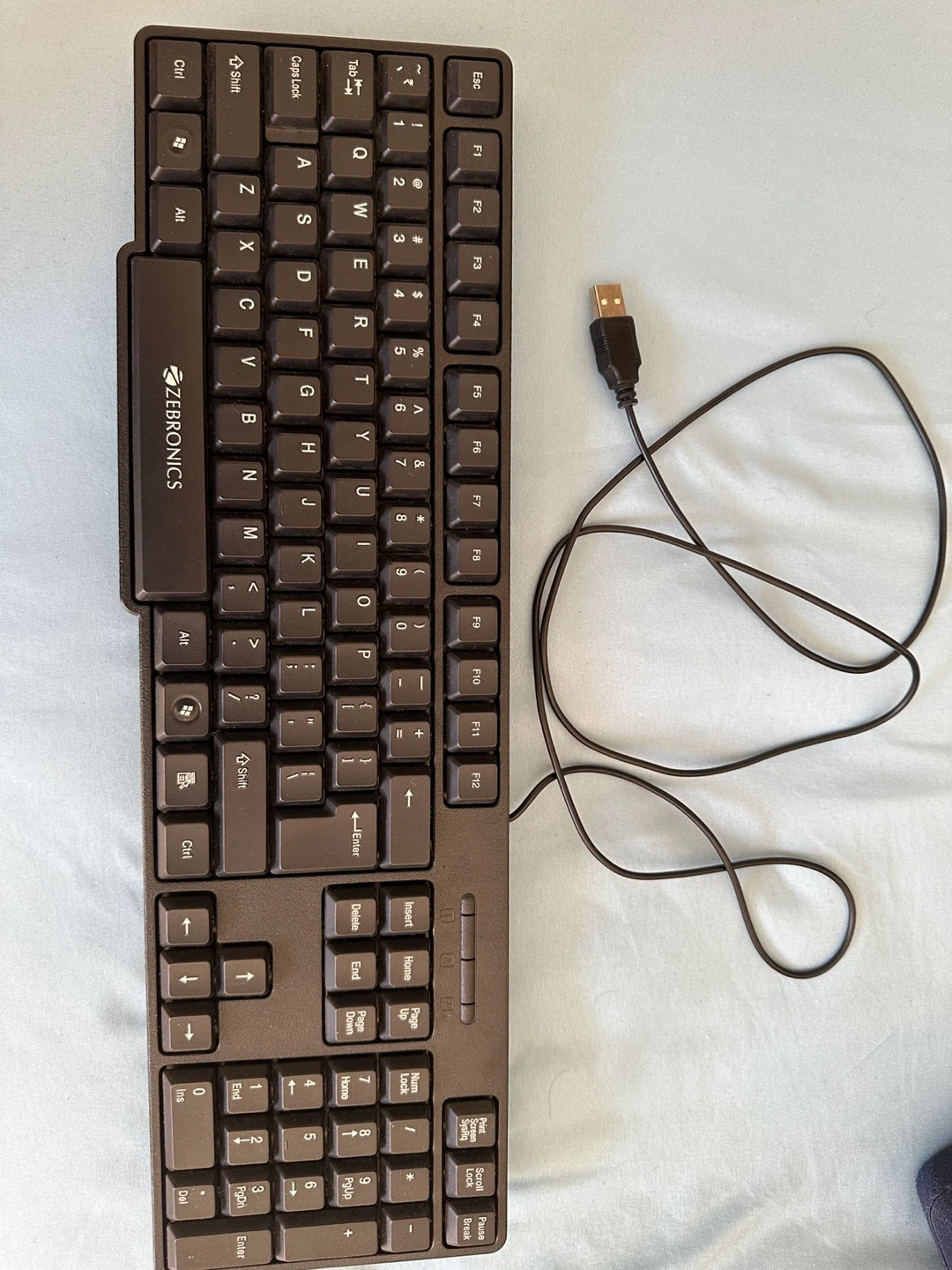 This is a Zebronics wired keyboard. It connects via USB. Features a standard QWERTY layout with a numeric keypad.