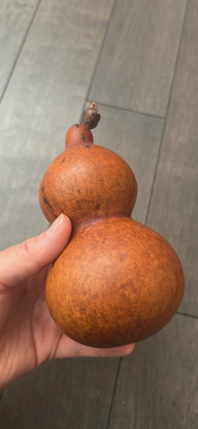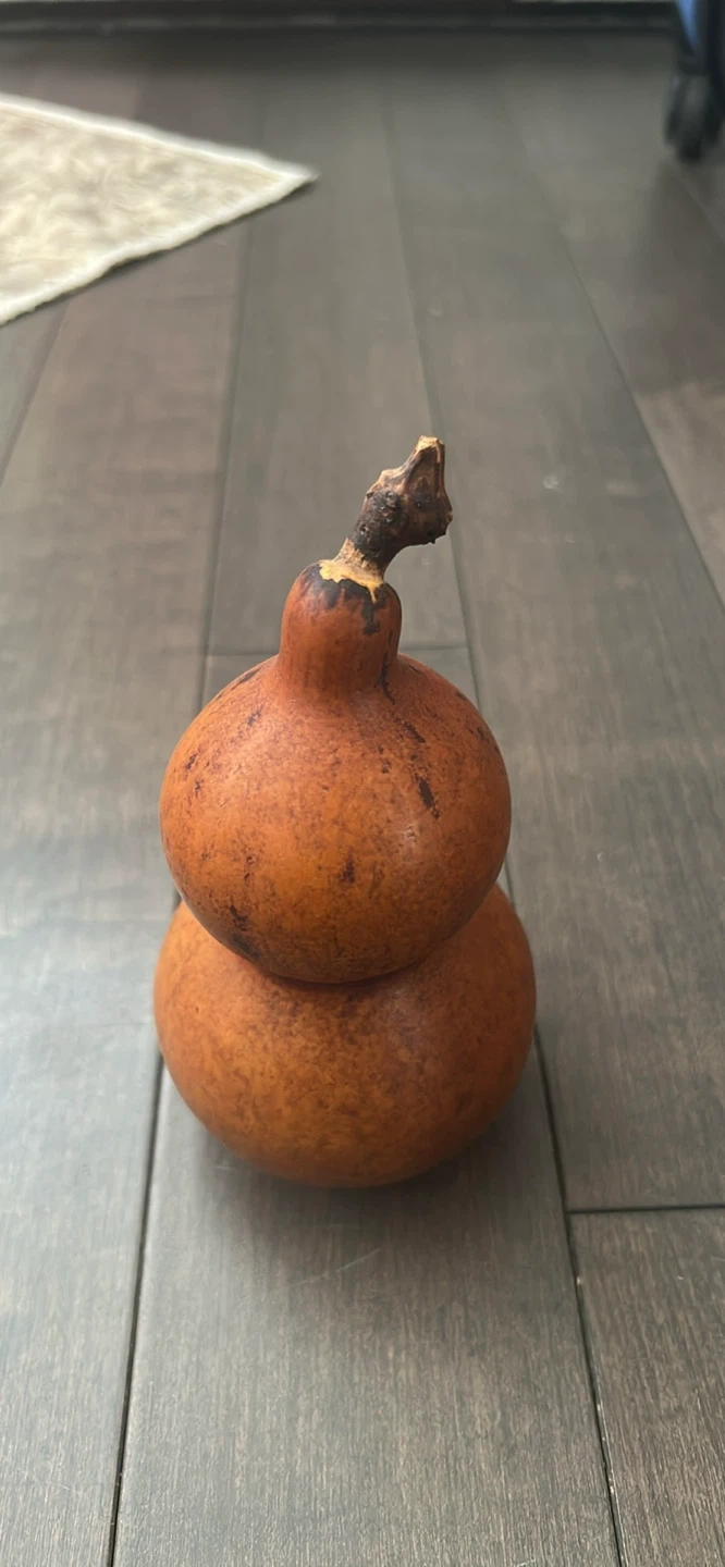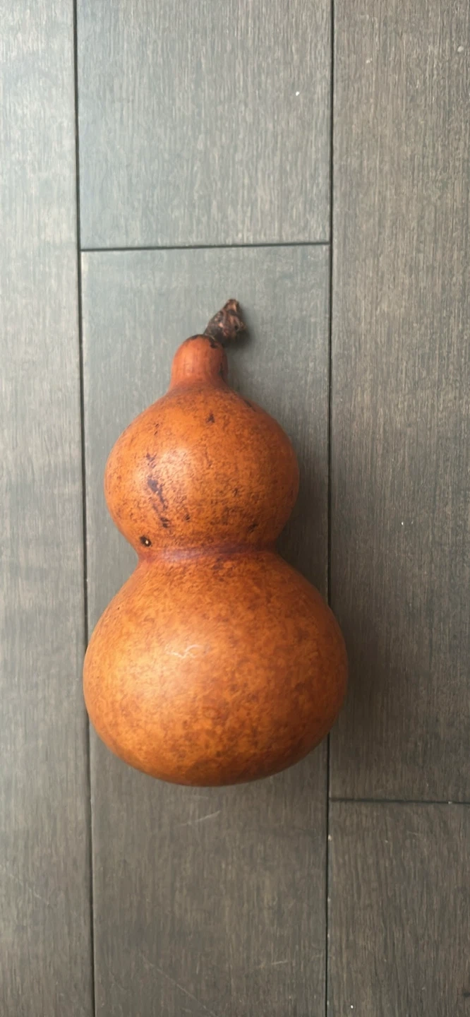 This is a dried, double-chambered gourd. It has a natural orange-brown colour and a rustic, textured finish. Its unique shape makes it a lovely decorative accent.