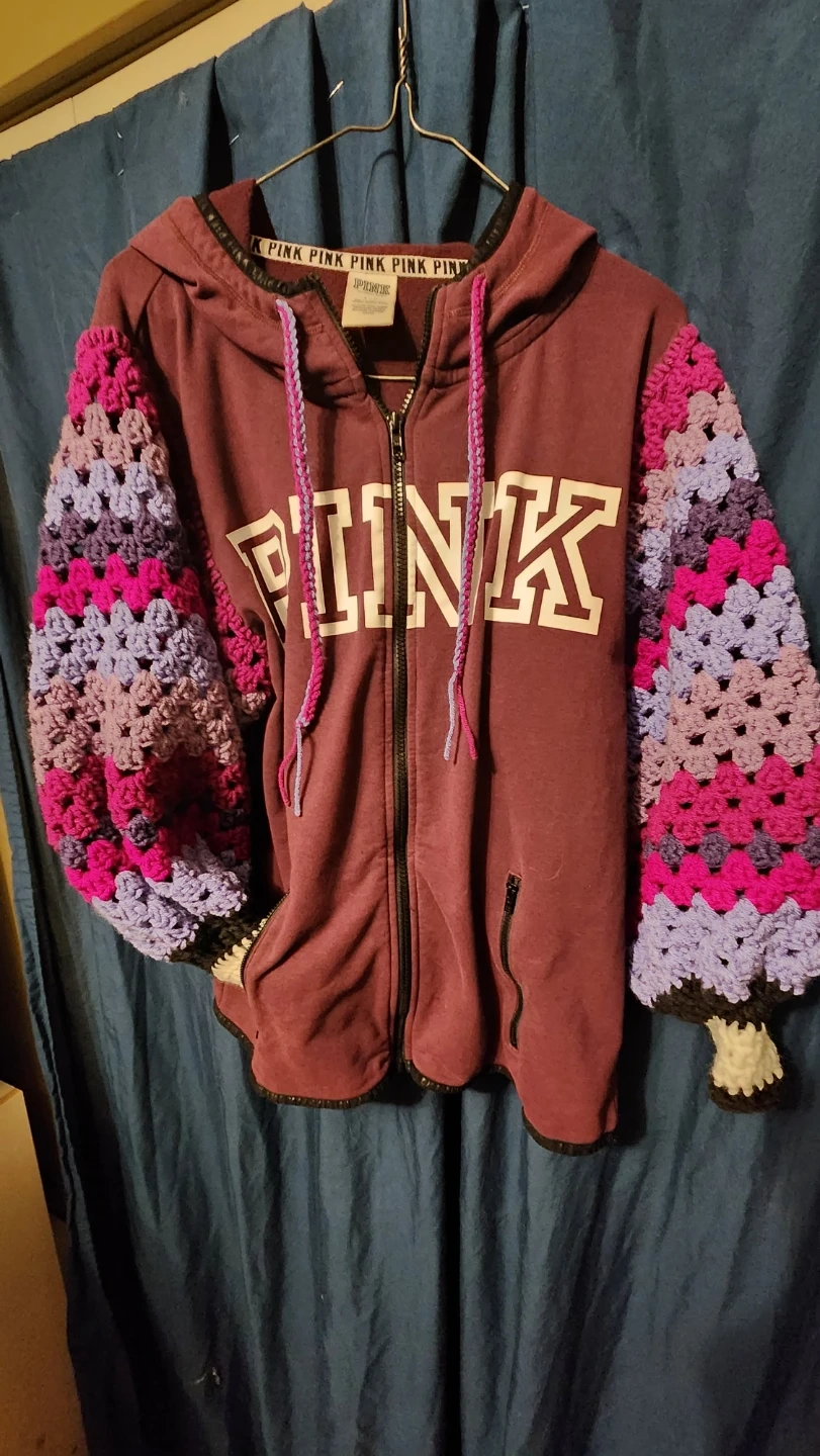 This burgundy full zip hoodie is from PINK, Victoria's Secret. It features unique crochet sleeves in shades of pink, purple, and lavender. The hoodie is size large. Great for adding a unique touch to your casual wear!