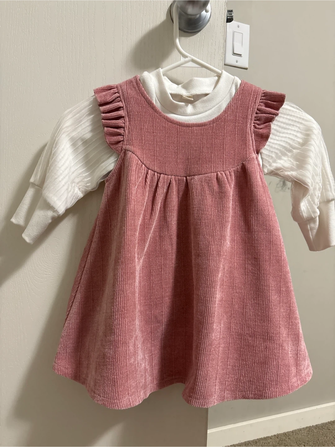This adorable set features a pink corduroy pinafore dress with ruffled shoulder straps. It comes with a white ribbed long-sleeve shirt. Perfect for layering during cooler days!